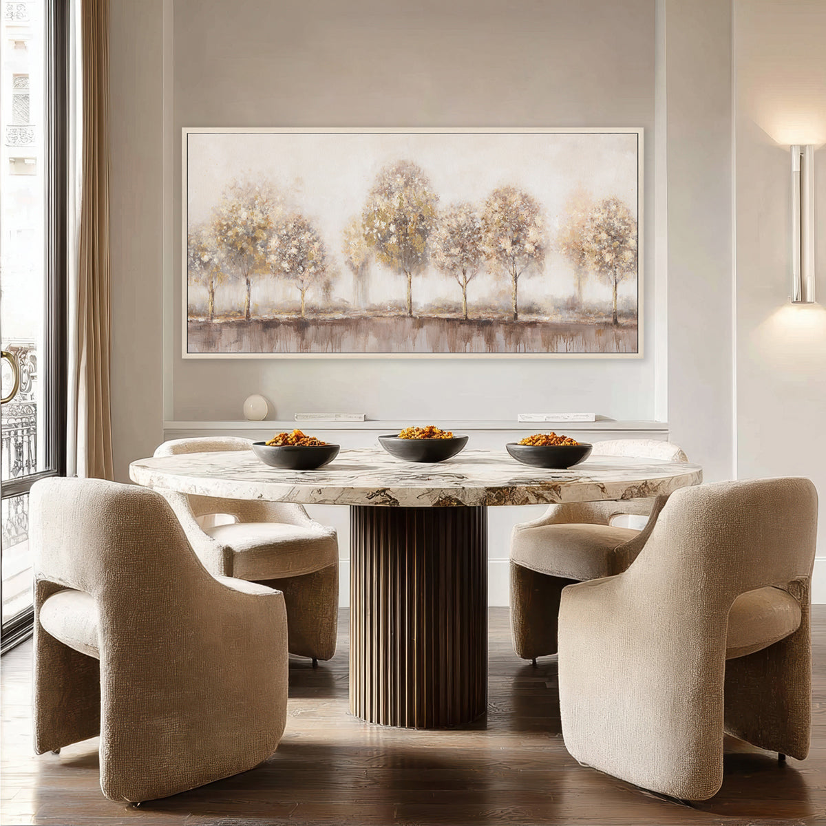 Soft golden and grey tones depict a serene row of trees, bringing warmth and harmony to any space.