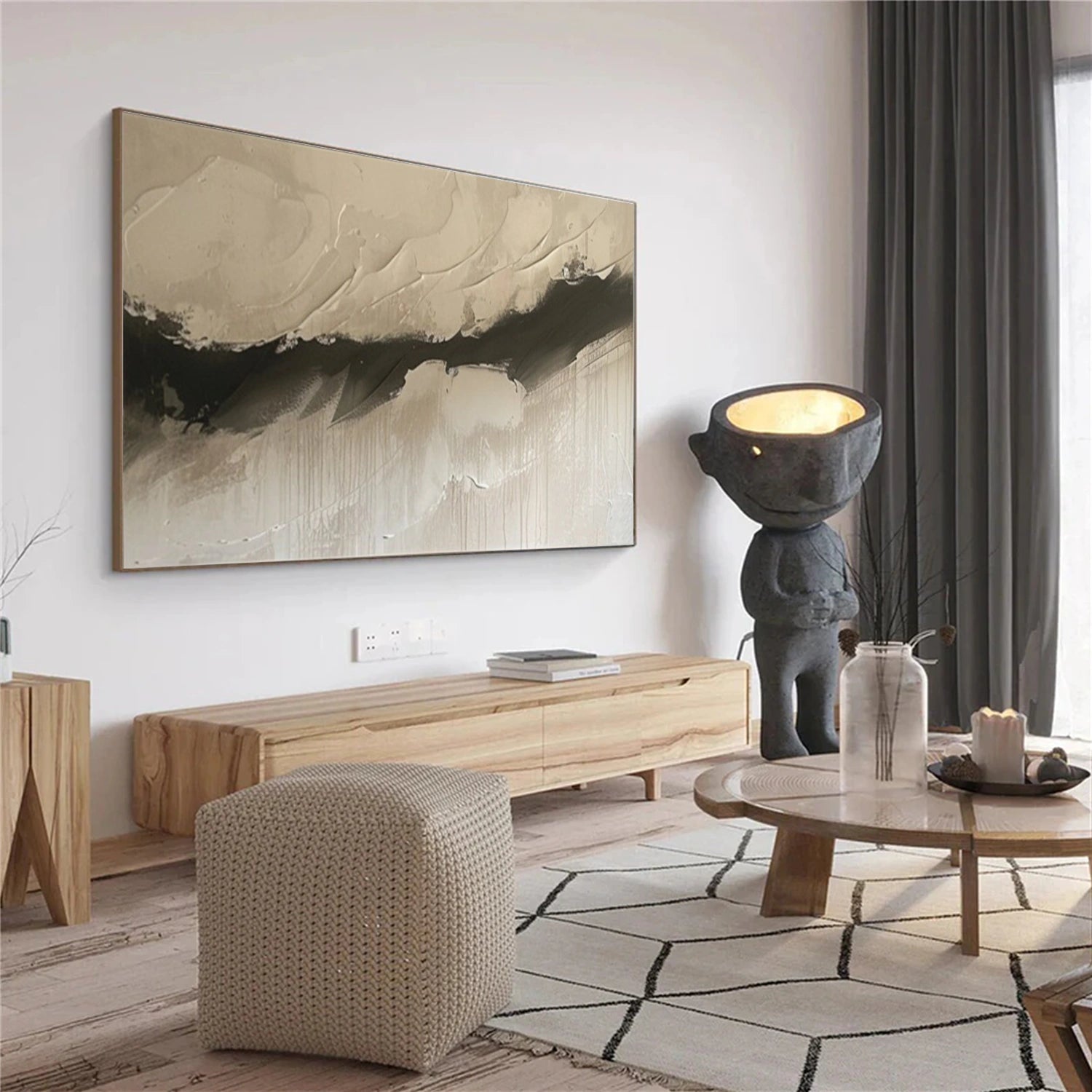 This Sand Drift Beige Abstract Painting features sweeping beige textures layered with deep charcoal strokes, creating a soft yet dramatic sense of movement. The palette-knife technique forms sculptural ridges, while gentle drips add an expressive contemporary edge.