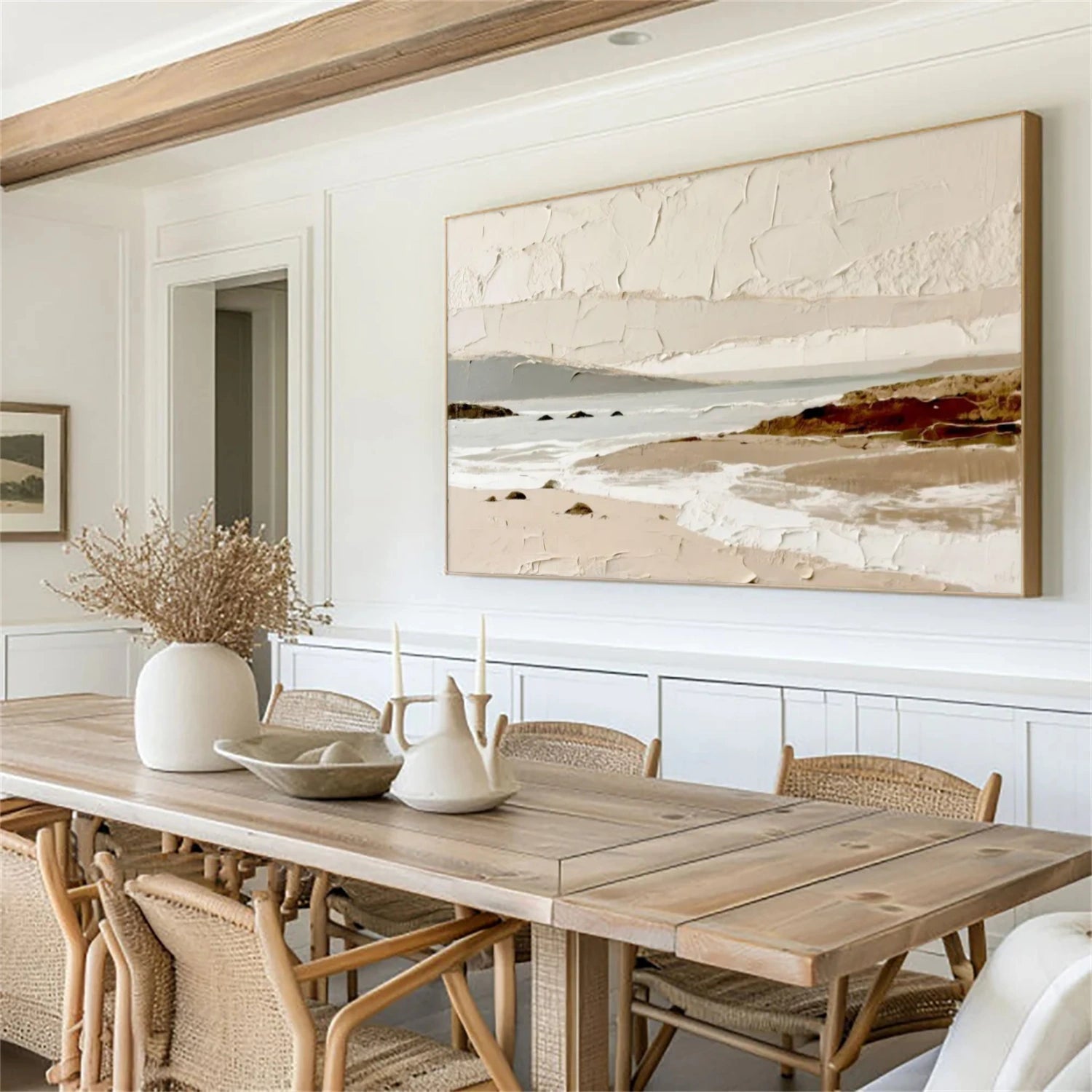 This textured coastal painting captures the quiet elegance of a sandy shoreline in soft beige, ivory, and warm clay tones. Gentle waves meet the shore under layered skies sculpted with thick impasto strokes, creating a soothing and organic atmosphere. Perfect for calm, modern, and nature-inspired interiors, this artwork brings the peaceful rhythm of the coast into your home.
