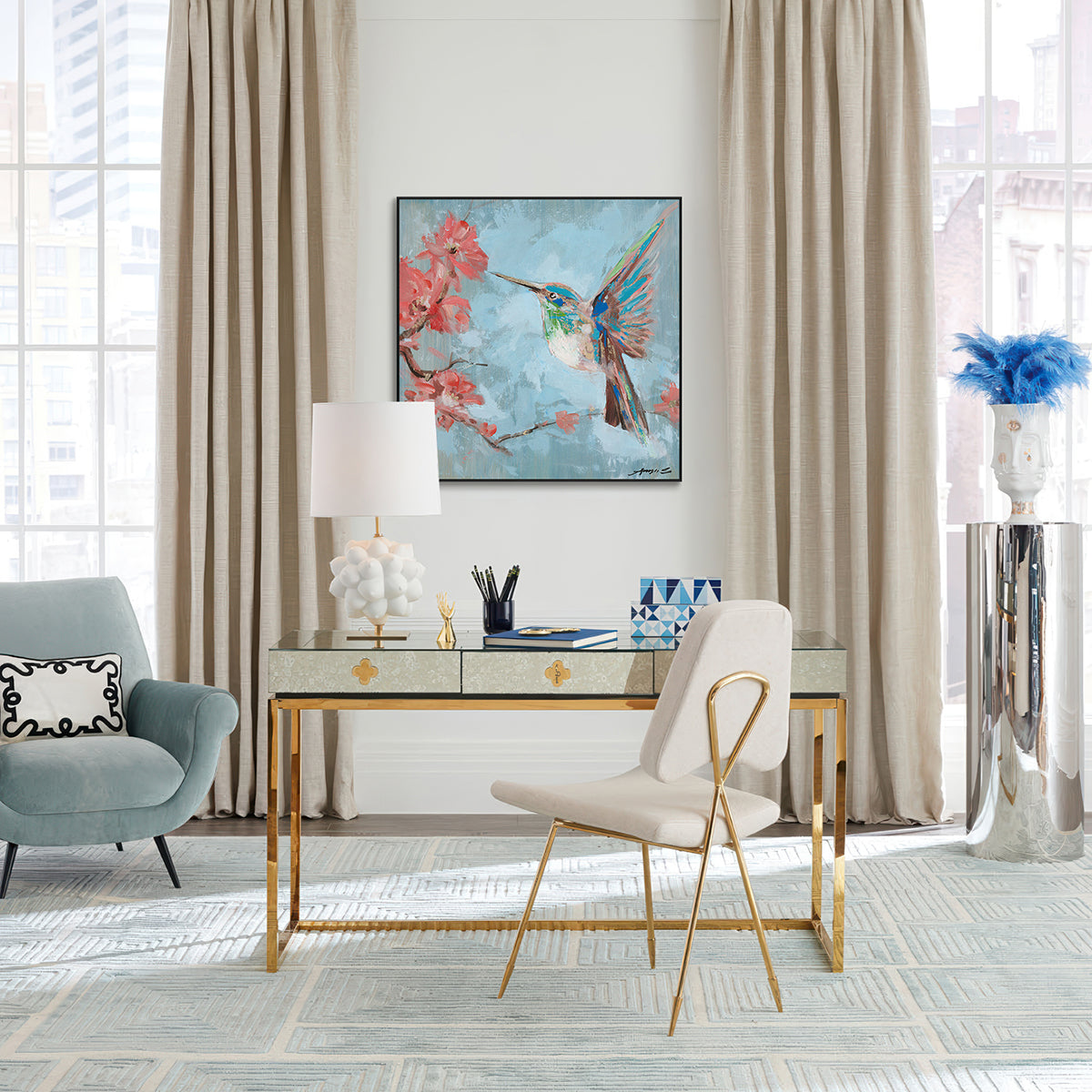 A lively hand-painted hummingbird with pink blossoms, symbolizing energy and grace for modern interiors.