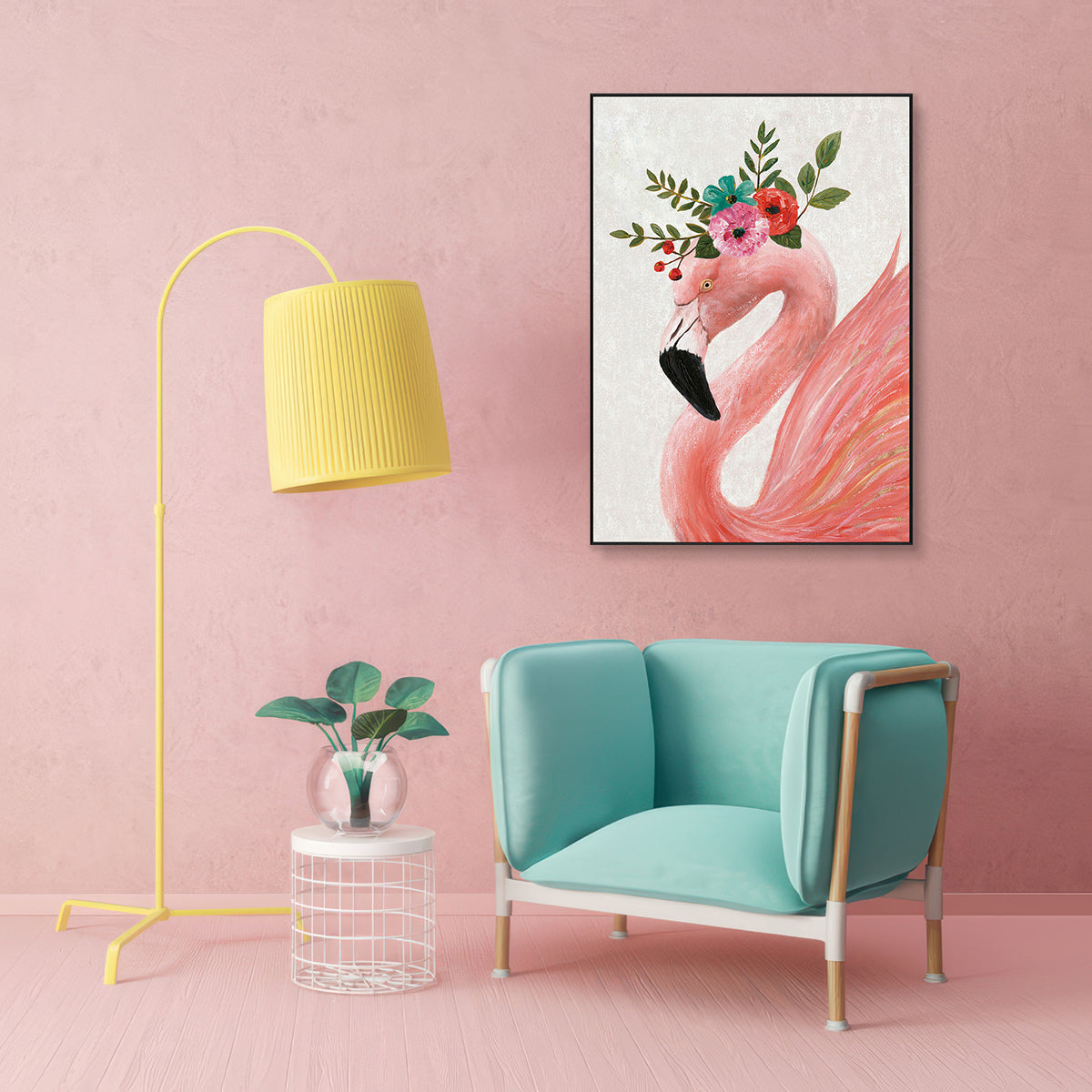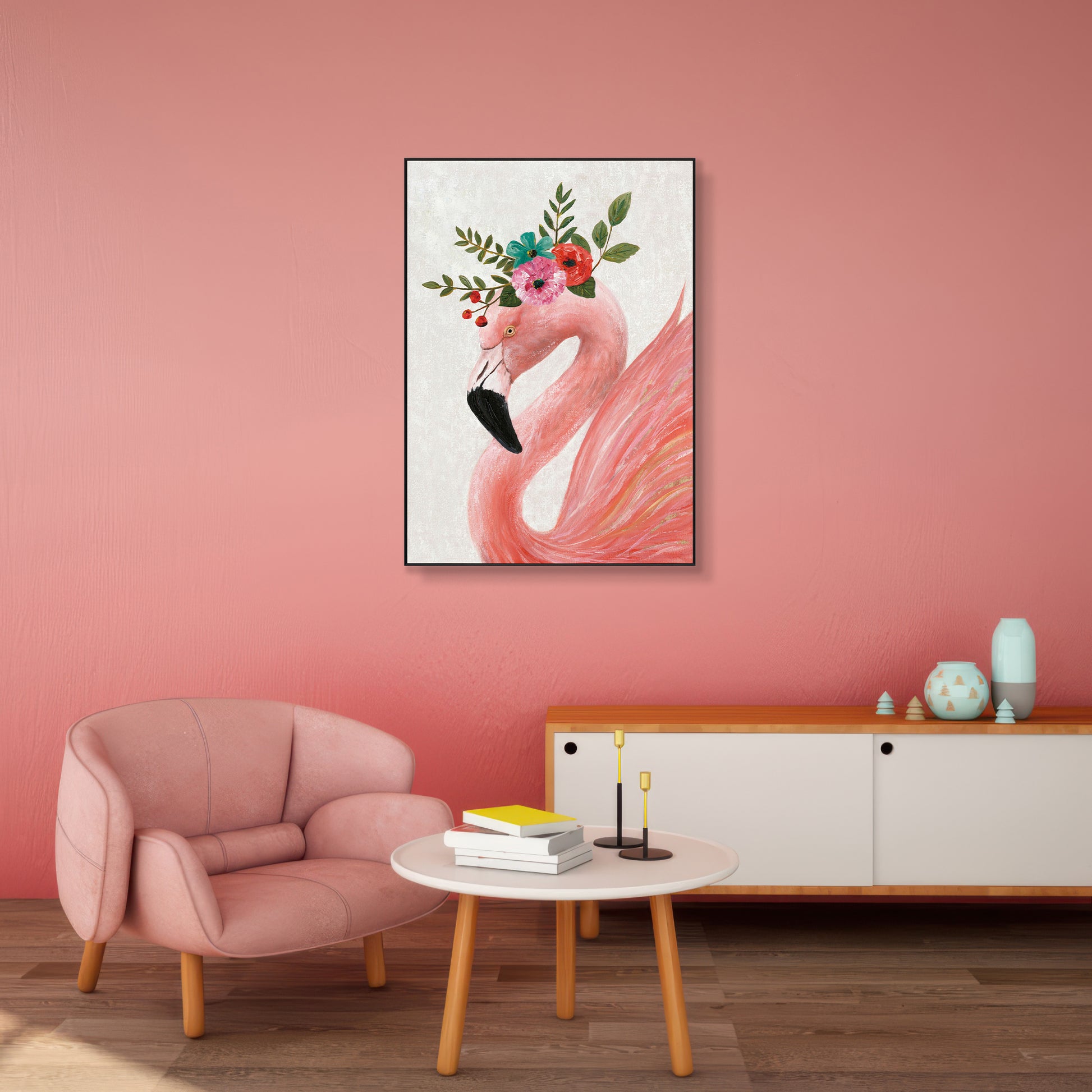 “Blush Charm” captures the graceful elegance of a flamingo adorned with a vivid floral crown. This pink flamingo wall art blends tropical vitality with modern minimalism, featuring soft pink tones and refined brushstrokes that radiate warmth and femininity. Perfect for adding a touch of nature-inspired sophistication to bedrooms, living rooms, or creative studios, this tropical bird painting brings a sense of beauty, serenity, and charm into your home décor.
