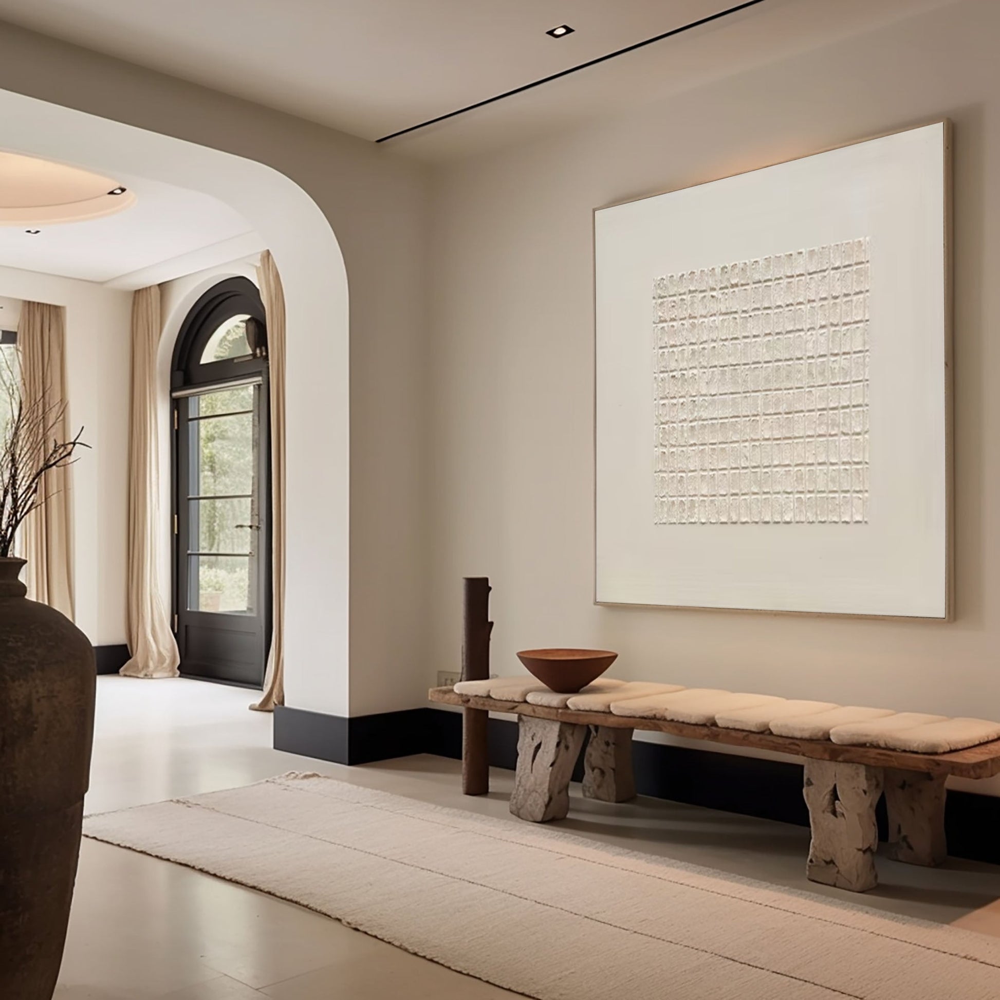 As a piece of Minimal White Texture Art, it embodies restraint, order, and spatial harmony—ideal for modern minimalist, wabi-sabi, and luxury interiors. The focused composition also defines it as a Centered Grid Abstract Painting, offering quiet sophistication without visual noise.