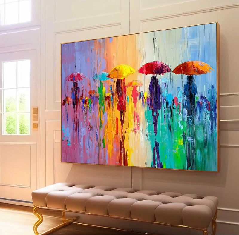 This colorful umbrella abstract painting captures a lively crowd walking through a rainy street, rendered in bold palette-knife strokes. The vibrant blend of pink, yellow, turquoise, violet, and orange creates a dynamic atmosphere full of movement and emotion. Each umbrella becomes a pop of color against the softly blurred background, giving the artwork a dreamy, impressionistic charm. Perfect for brightening modern living rooms, hallways, studios, and creative spaces, it adds urban vibrancy and expressive color flow to any interior.