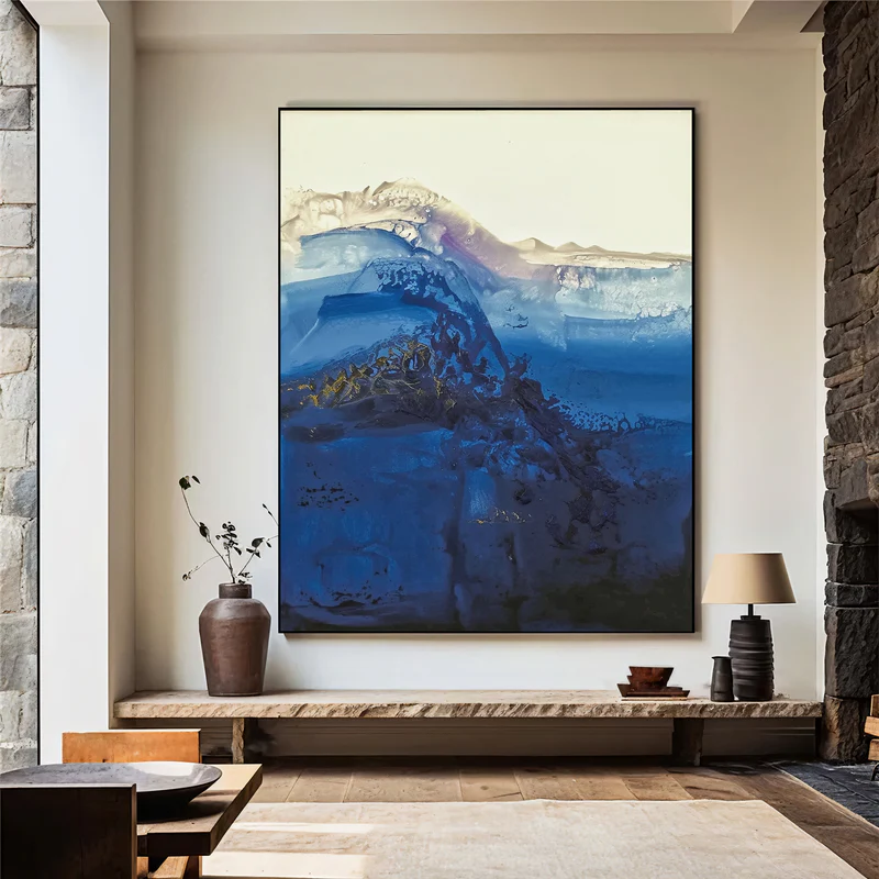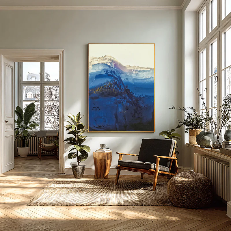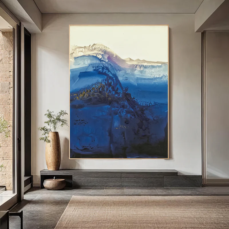 This abstract painting captures the dramatic depth of the ocean through powerful layers of midnight blue, cobalt, and soft ivory. The flowing transitions and dynamic textures evoke crashing waves and shifting tides, delivering both motion and serenity at once. Featuring a deep ocean gradient and tide-borne textured energy, this artwork becomes a captivating centerpiece that enriches living rooms, bedrooms, and contemporary coastal-style interiors.
