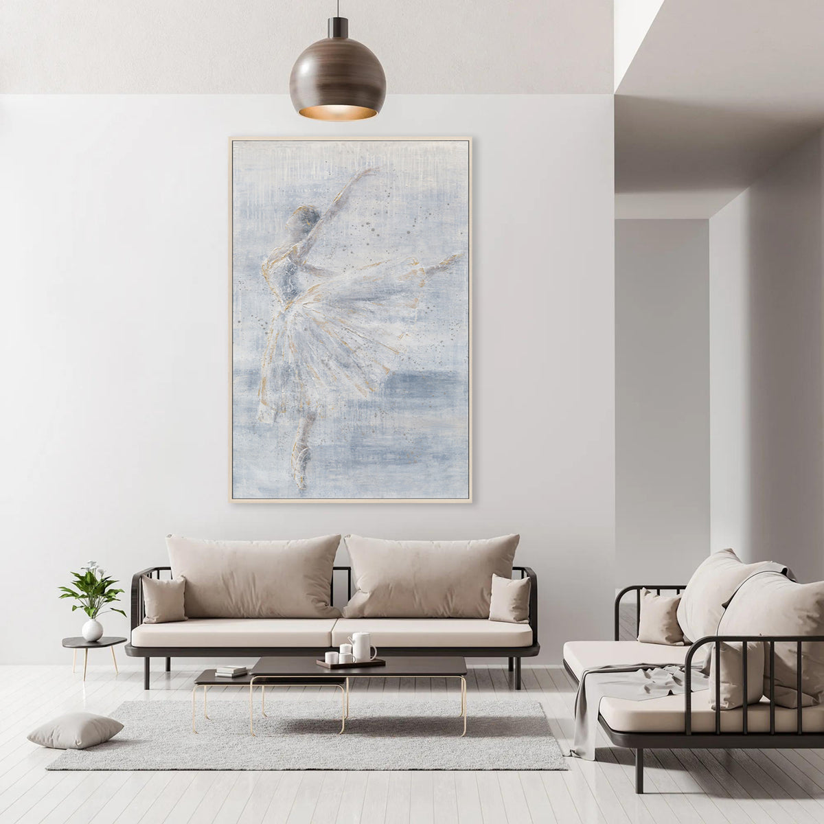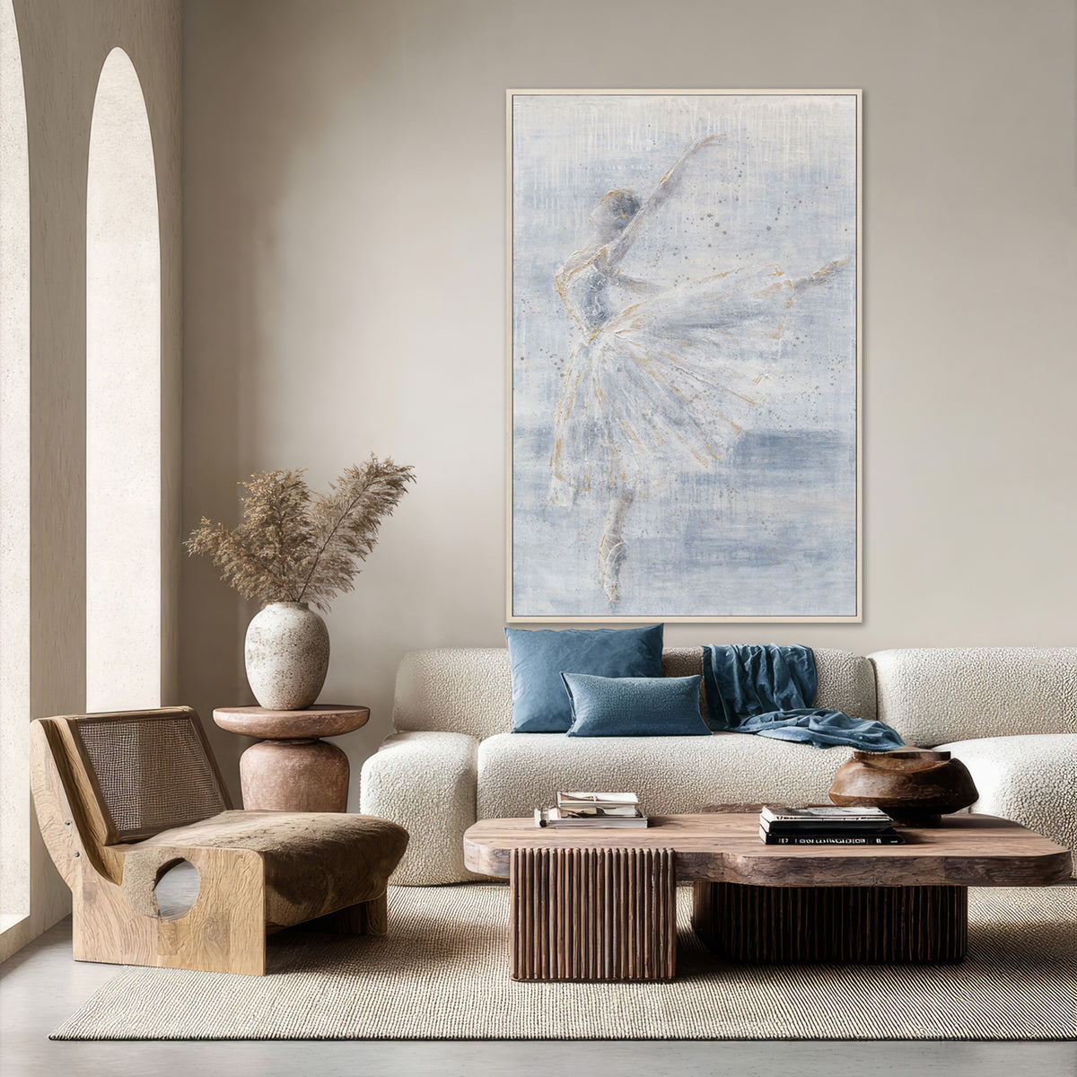 A graceful ballerina in soft blue tones captures the elegance of dance. Perfect for adding artistic charm to modern interiors.