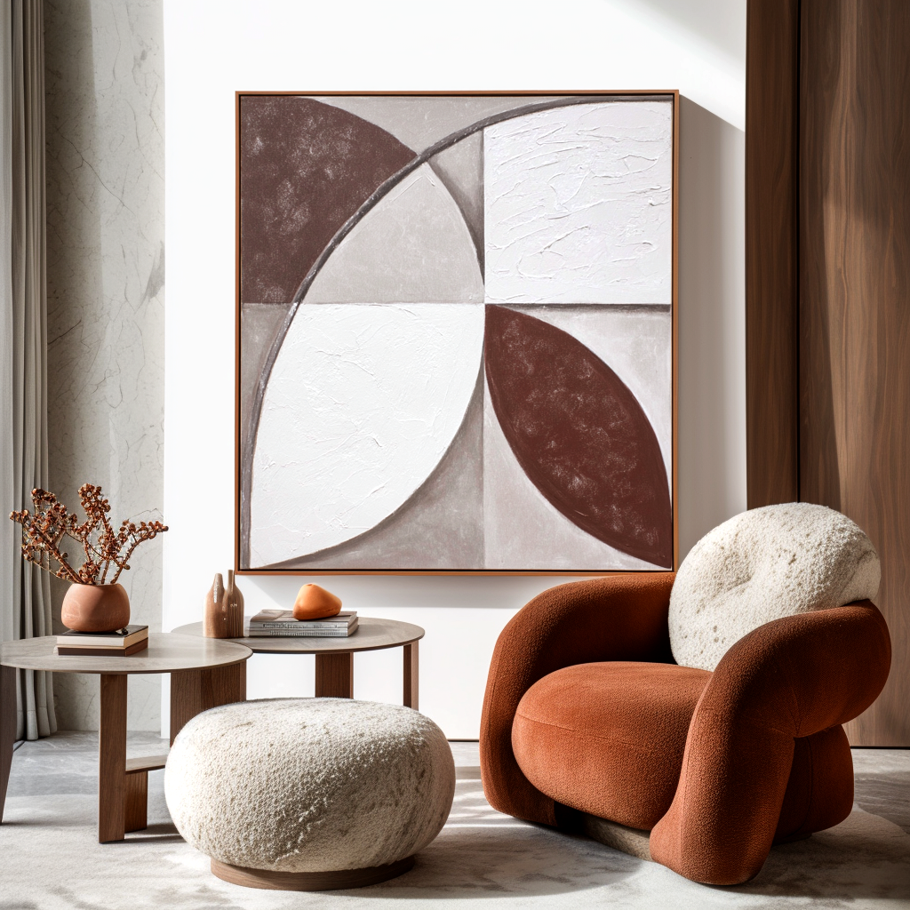 Earth Geometry is a celebration of balance and structure, rendered in warm brown, ivory, and taupe tones. This Minimalist Abstract Canvas Painting features smooth intersecting shapes and tactile surfaces that bring depth and calm to contemporary interiors. Its geometric rhythm reflects harmony between form and texture, while the earthy palette complements neutral and modern décors. Hand-painted with subtle dimension, it embodies understated sophistication — perfect for living rooms, offices, or gallery-style walls.