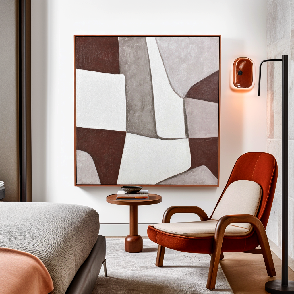 Earth Geometry celebrates balance and contrast through a refined composition of neutral tones and soft geometry. This Minimalist Abstract Shape Painting features layered textures of beige, taupe, and brown, evoking a sense of organic calm and architectural rhythm. Its understated palette complements contemporary, Scandinavian, or Japandi-style interiors with timeless sophistication.
