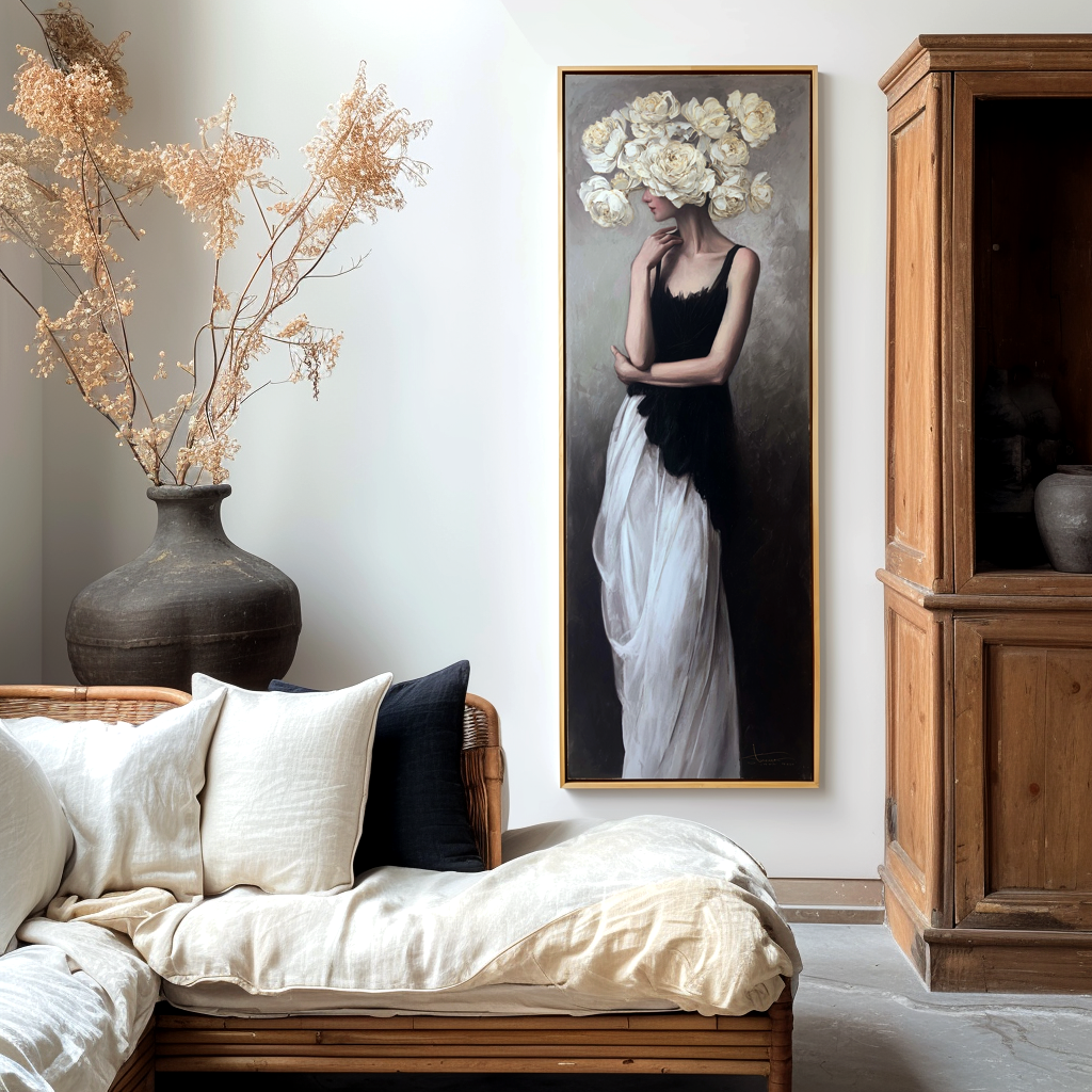 Elegance in Bloom portrays a graceful woman draped in a black and white gown, her face partially veiled by a crown of blooming ivory flowers. This Figurative Woman Portrait Painting blends realism with poetic abstraction, symbolizing purity, femininity, and inner calm. The refined brushwork and elongated composition make it a perfect centerpiece for luxury interiors, fashion boutiques, or art galleries.