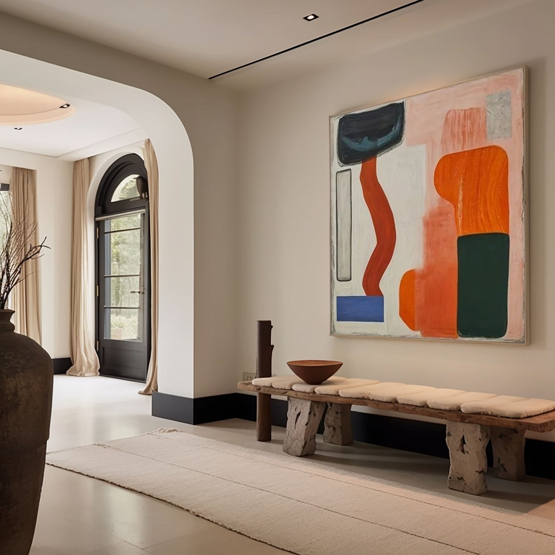 The flowing lines and solid blocks interact with quiet tension, giving this organic geometric abstract wall art a sculptural presence. As a sophisticated modern color block abstract painting, it brings warmth and artistic depth to contemporary living rooms, dining spaces, or minimalist interiors.