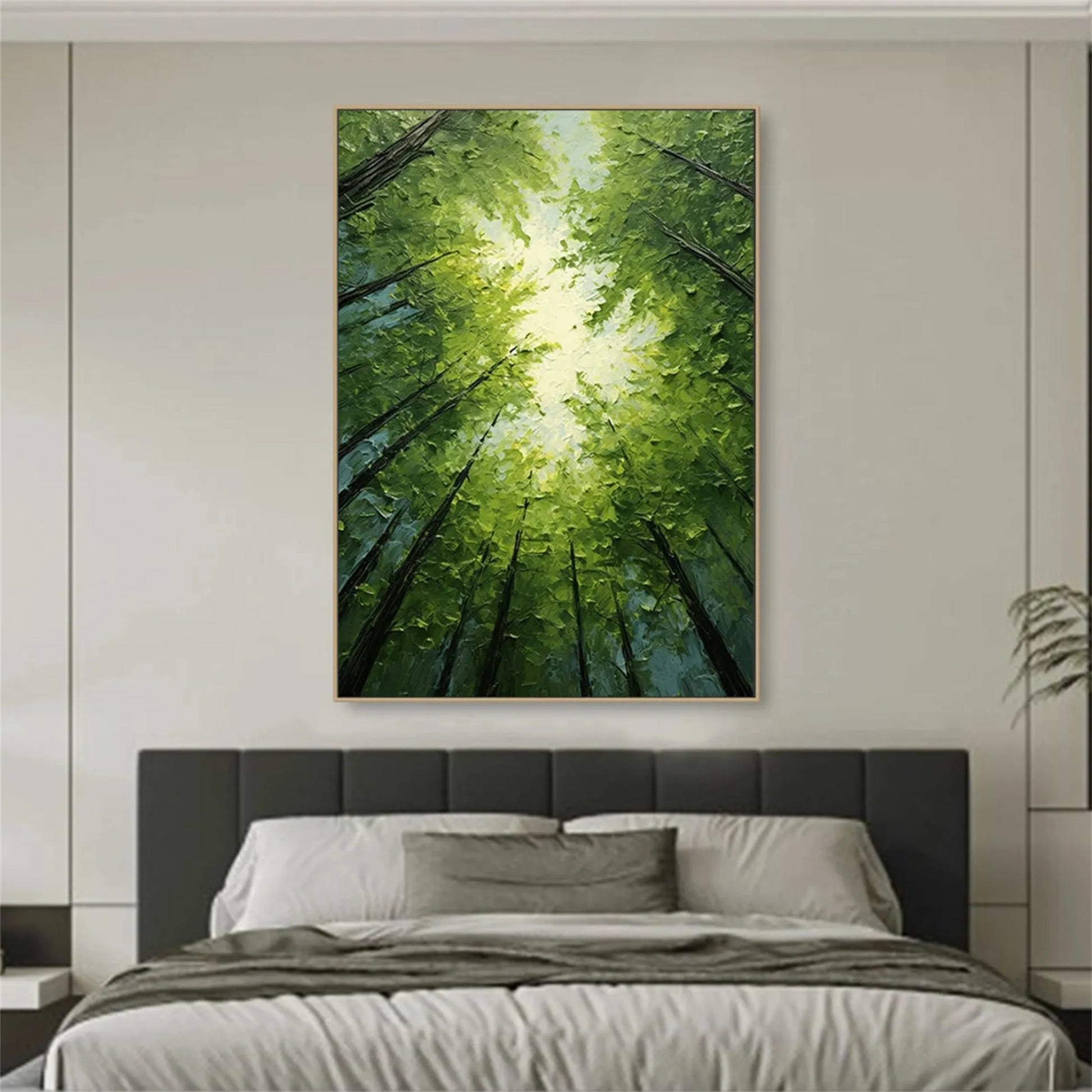 Emerald Canopy Light Forest Painting captures an upward view of towering trees, where layered green foliage is rendered in rich, textured brushstrokes. Light pours through the center of the forest canopy, creating a calm, uplifting atmosphere filled with depth and movement. The contrast between shadowed trunks and luminous leaves draws the eye upward, evoking openness and quiet reflection.
