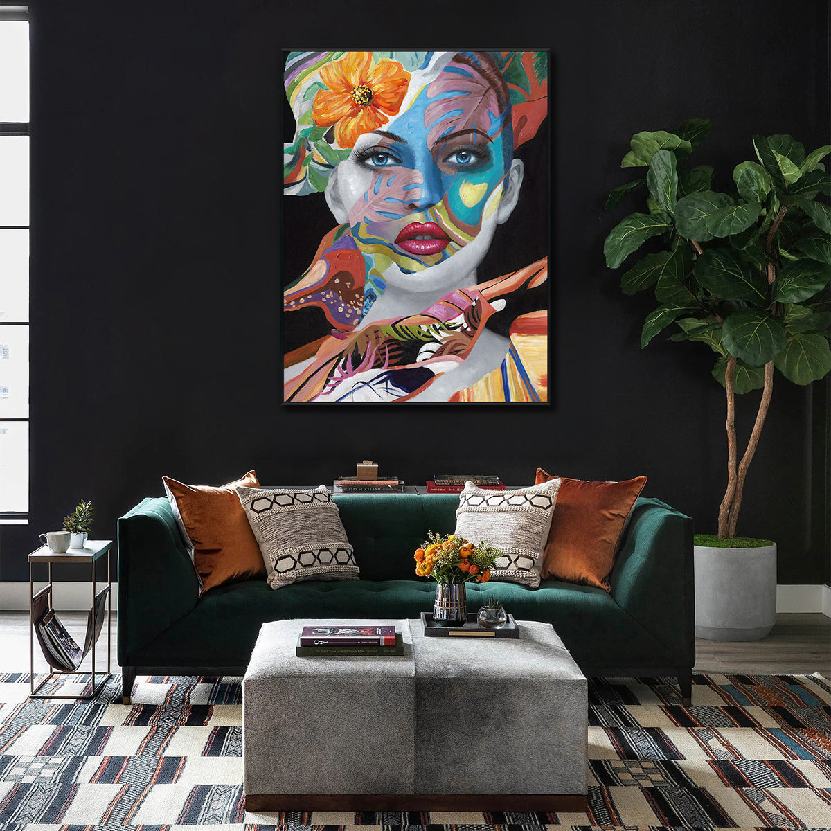 A striking portrait merging vibrant florals and bold abstract patterns, celebrating individuality and artistic freedom.