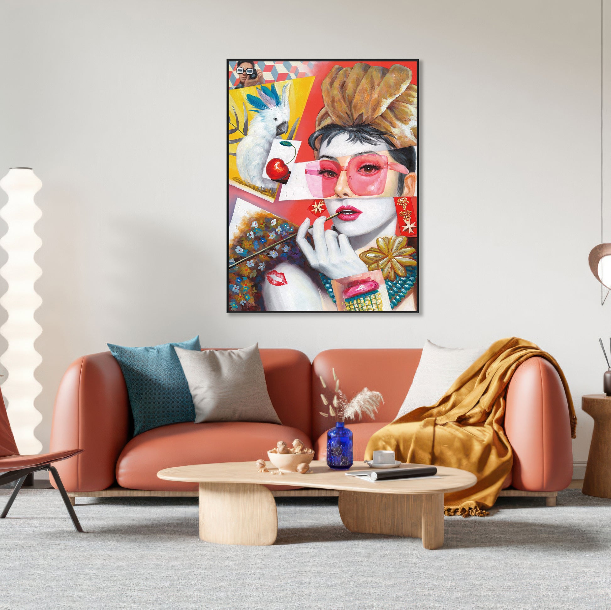This vibrant pop art painting blends bold portraiture with eclectic details — from the striking woman in oversized pink sunglasses to the parrot, cherries, and floral motifs. The playful colors and layered symbolism create a lively, fashion-forward statement piece perfect for modern interiors seeking energy and style.