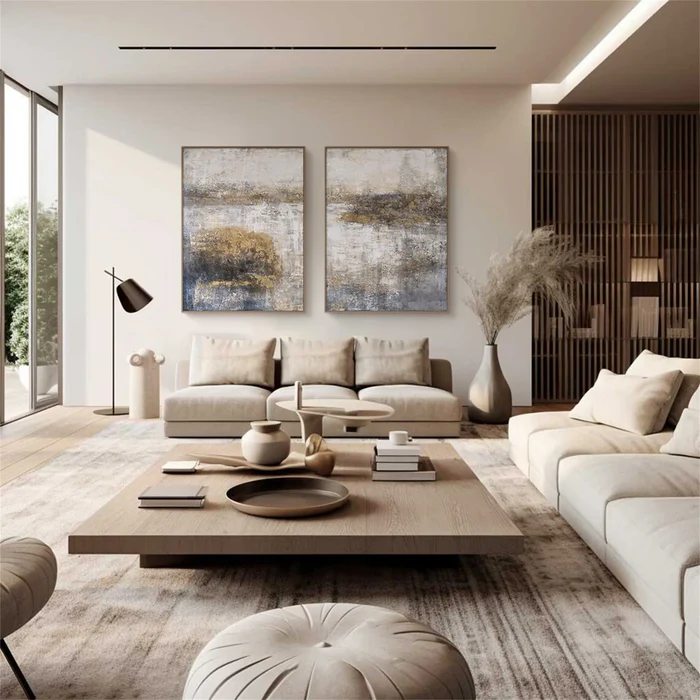The Golden Haze Abstract Landscape Painting Set evokes the calm mystery of nature at dawn — where golden light meets misty reflections. Hand-painted with rich layers of texture and soft metallic tones, each piece radiates depth and warmth, perfectly complementing modern, minimalist, or neutral interiors.