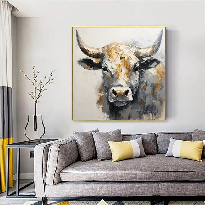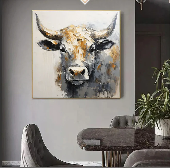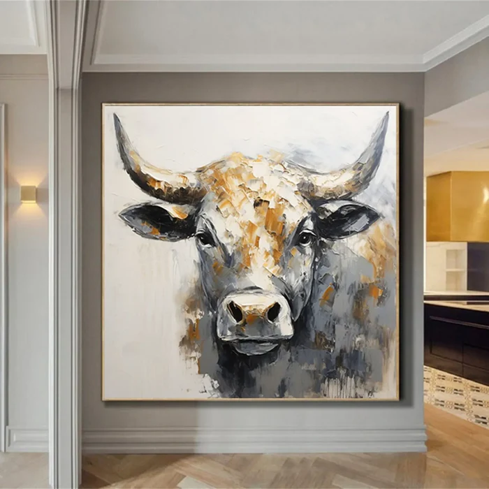 This Golden Strength Bull Painting radiates raw character and noble presence. The powerful gaze and sculpted muscle form are accentuated by textured strokes of warm gold and deep charcoal, giving the artwork a bold and confident personality. Infused with a heritage farmhouse spirit and a symbolic guardian energy, this piece instantly elevates living rooms, rustic interiors, office walls, and statement commercial spaces.