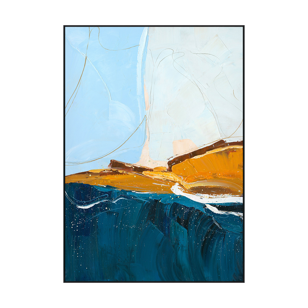 A captivating abstract seascape painting inspired by the meeting of land, sea, and sky. Hand-painted with rich blue, golden ochre, and ivory tones, it evokes the sunlight glimmering over coastal cliffs. The bold brushstrokes and layered texture bring energy and depth, while the soft sky adds serenity. This modern ocean wall art perfectly balances movement and calm — ideal for contemporary interiors seeking warmth and horizon-inspired beauty.