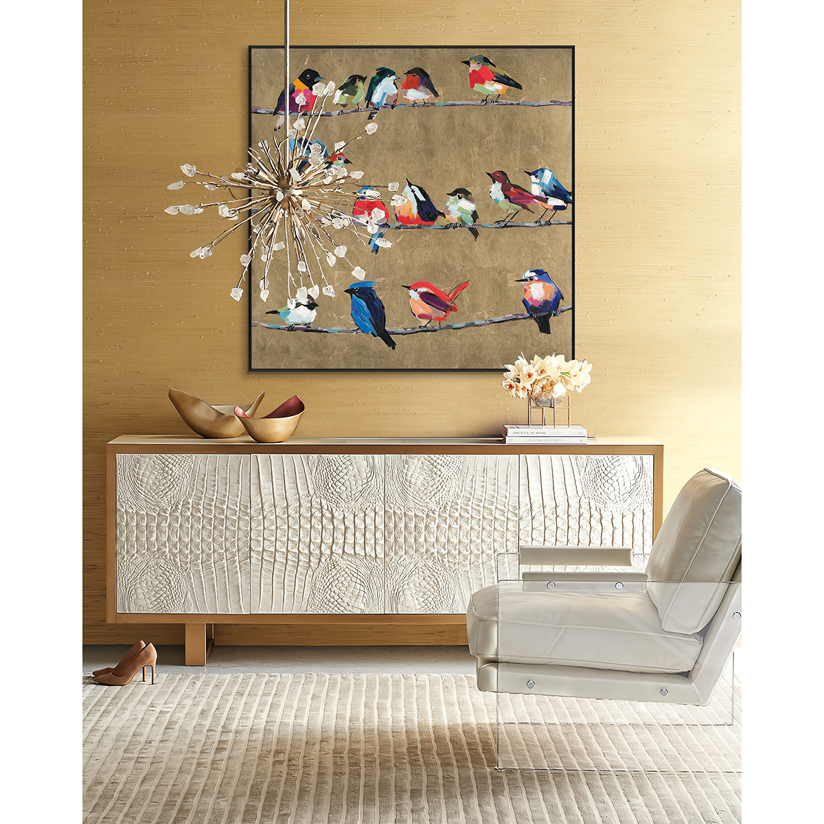 A lively painting of colorful birds on golden branches, adding vibrancy and elegance to any room.