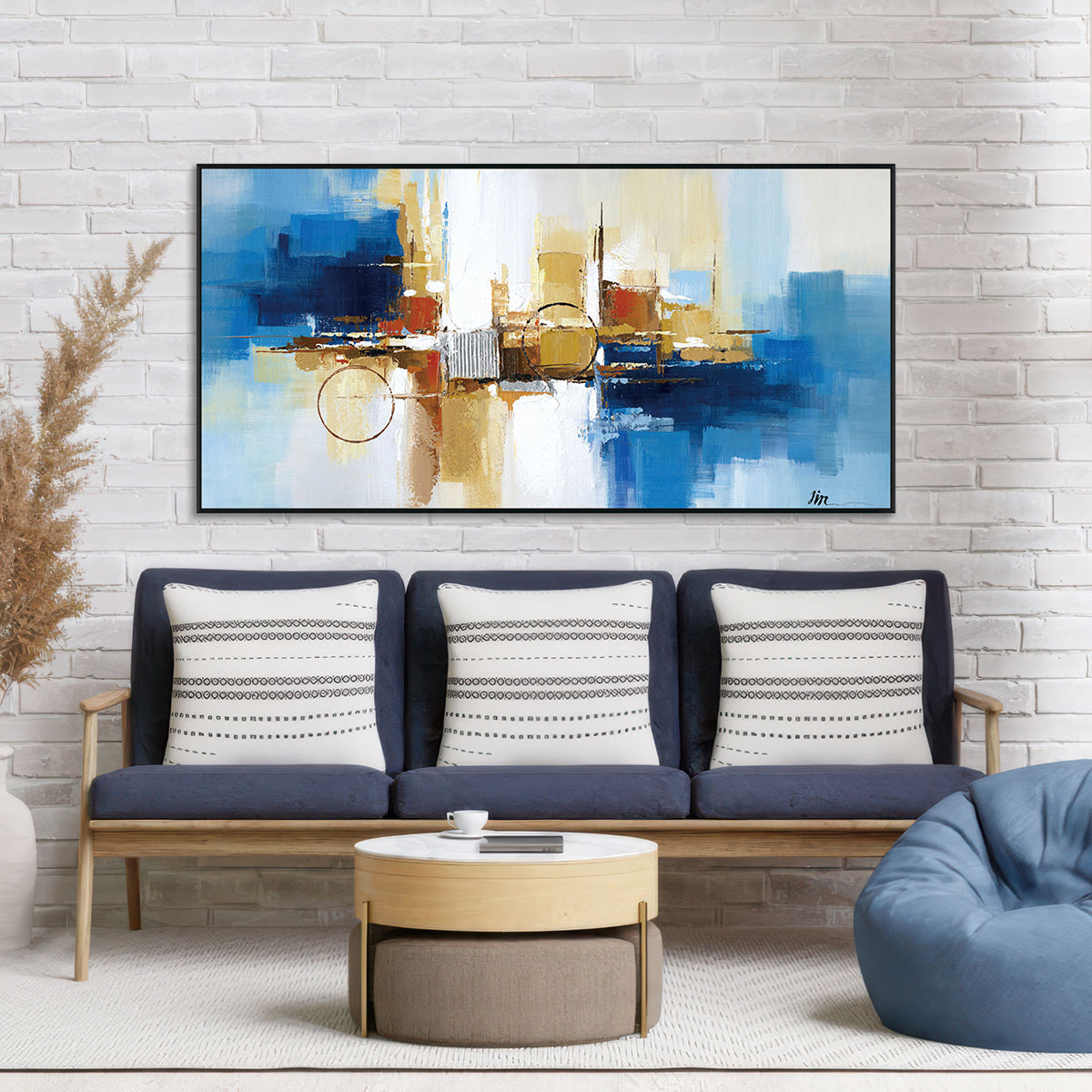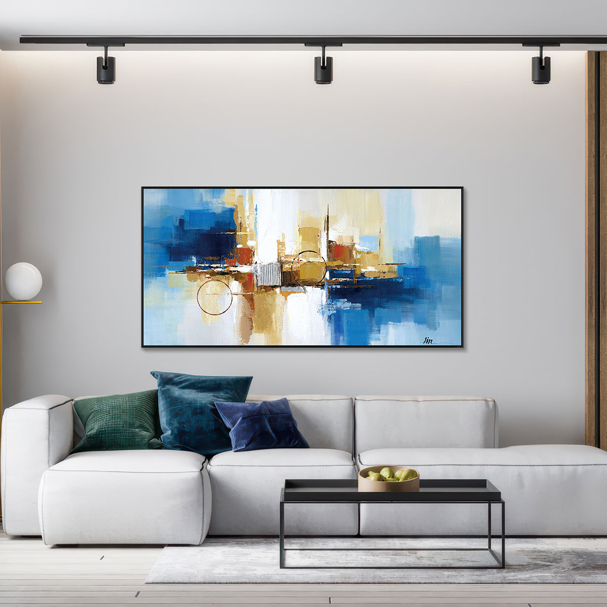 This modern abstract wall art enhances both contemporary and minimalist interiors, adding depth and elegance through its blue and gold color palette and textured dimension.