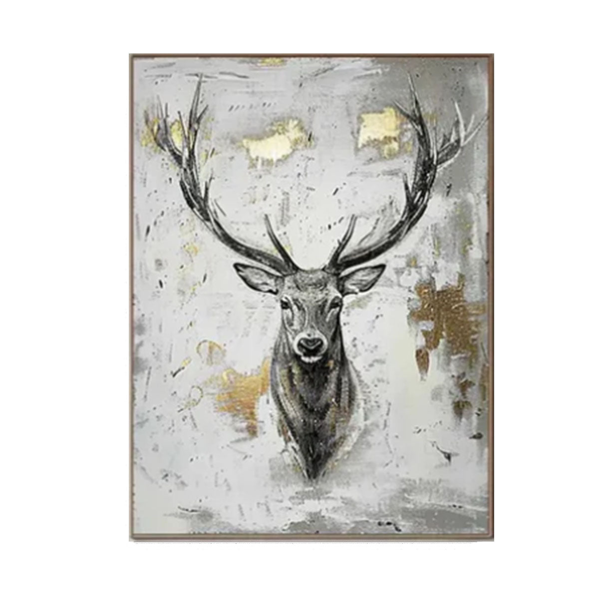 This captivating artwork portrays a majestic deer emerging from a misty, abstract field of white, grey, and gold. The delicate textures and shimmering metallic accents evoke a sense of calm, strength, and mystery. Ideal for modern interiors, this piece adds a touch of bold elegance while highlighting nature-inspired artistry. Perfect for living rooms, bedrooms, or entryways seeking depth and quiet sophistication.