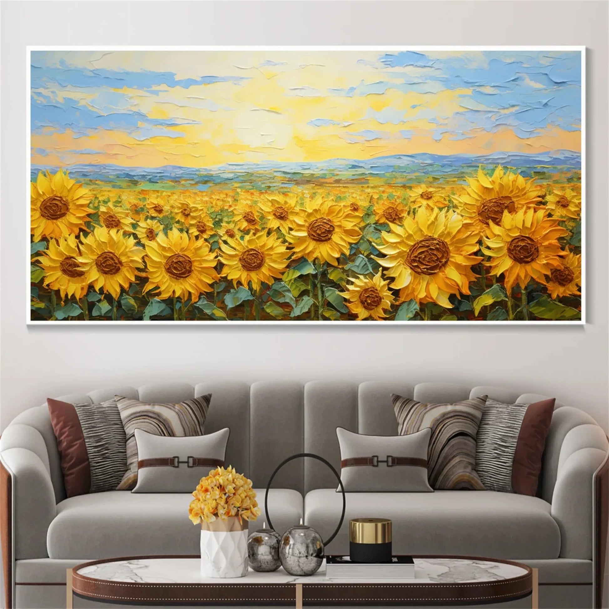 The expressive layering and sculptural strokes highlight the charm of a sunflower field oil painting and a textured floral oil artwork, making it a striking focal point for modern wall décor.