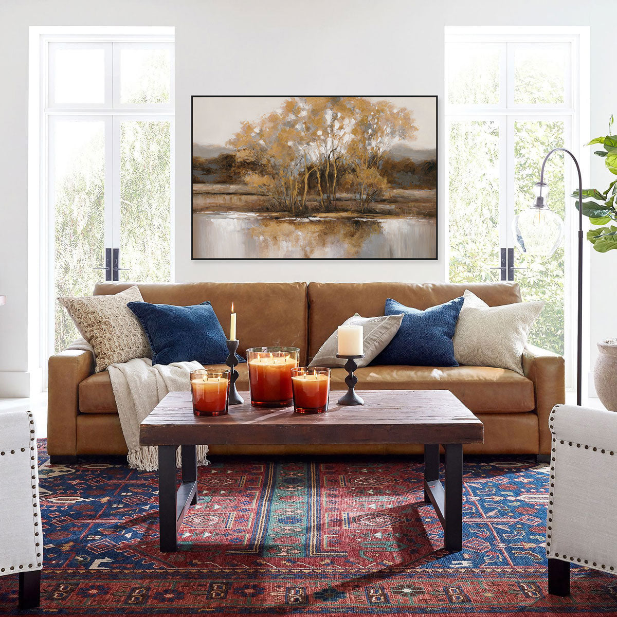 Golden trees reflecting on the lake create warmth and peace. This piece conveys an autumnal tranquil atmosphere, adding sophistication to interiors.