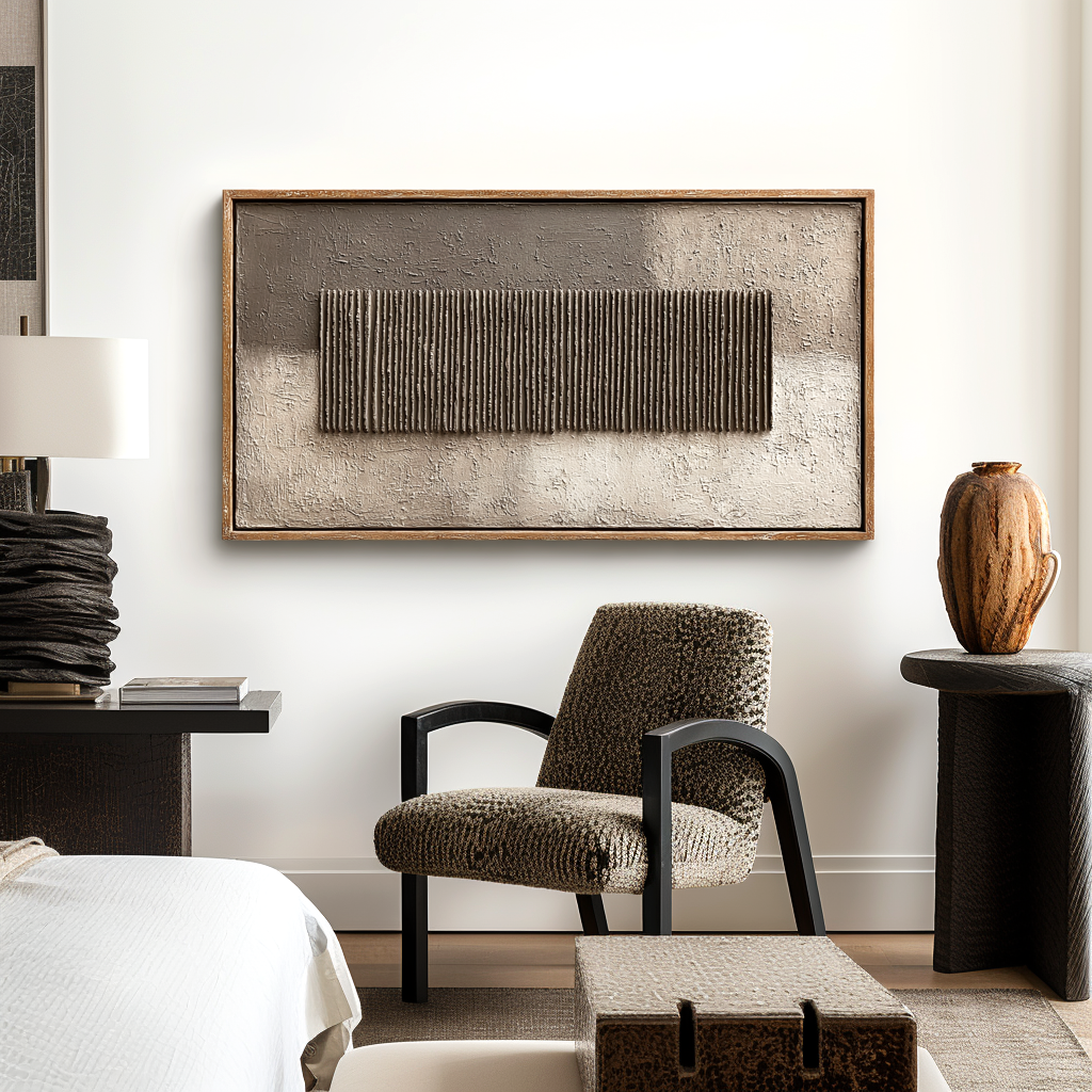Horizon Calm captures the essence of serenity through balanced texture and muted tones. This Wabi Sabi Textured Relief Painting blends horizontal rhythm and tactile depth, creating a tranquil statement for any minimalist or Japandi interior. Its handcrafted lines evoke both structure and softness, inviting stillness and reflection in your living space