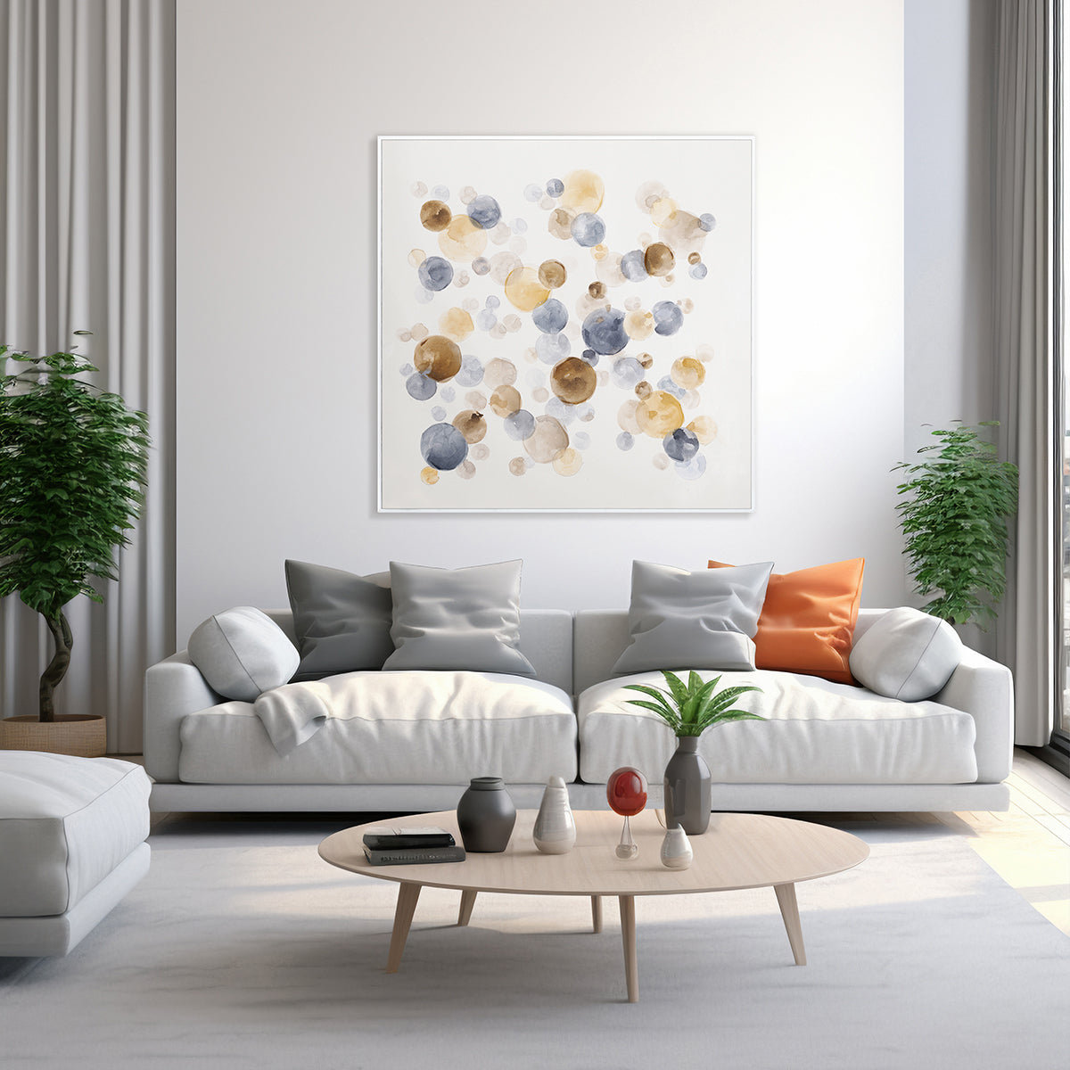 Overlapping watercolor dots create a lively rhythm, blending warm and cool tones that express modern abstraction and spatial rhythm.