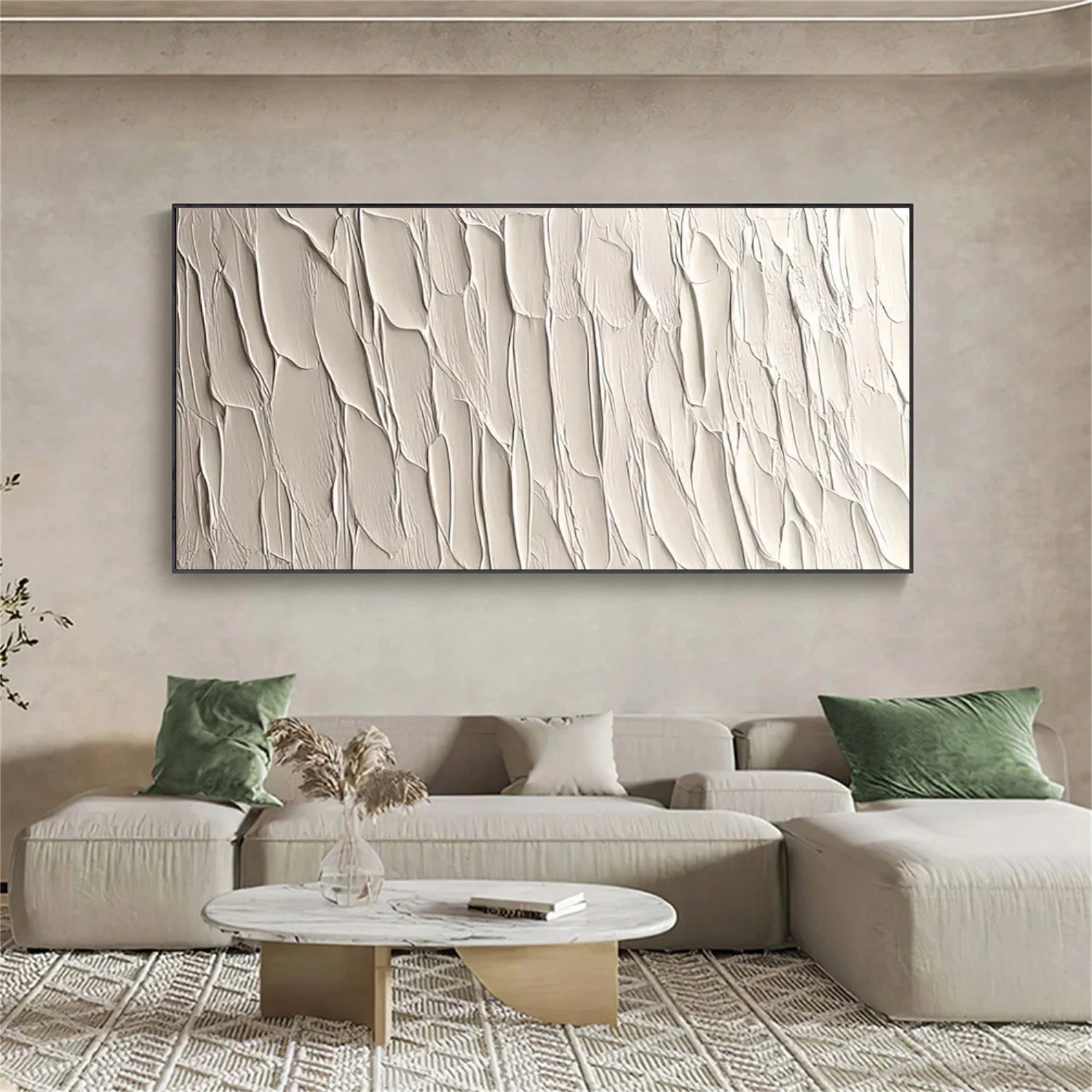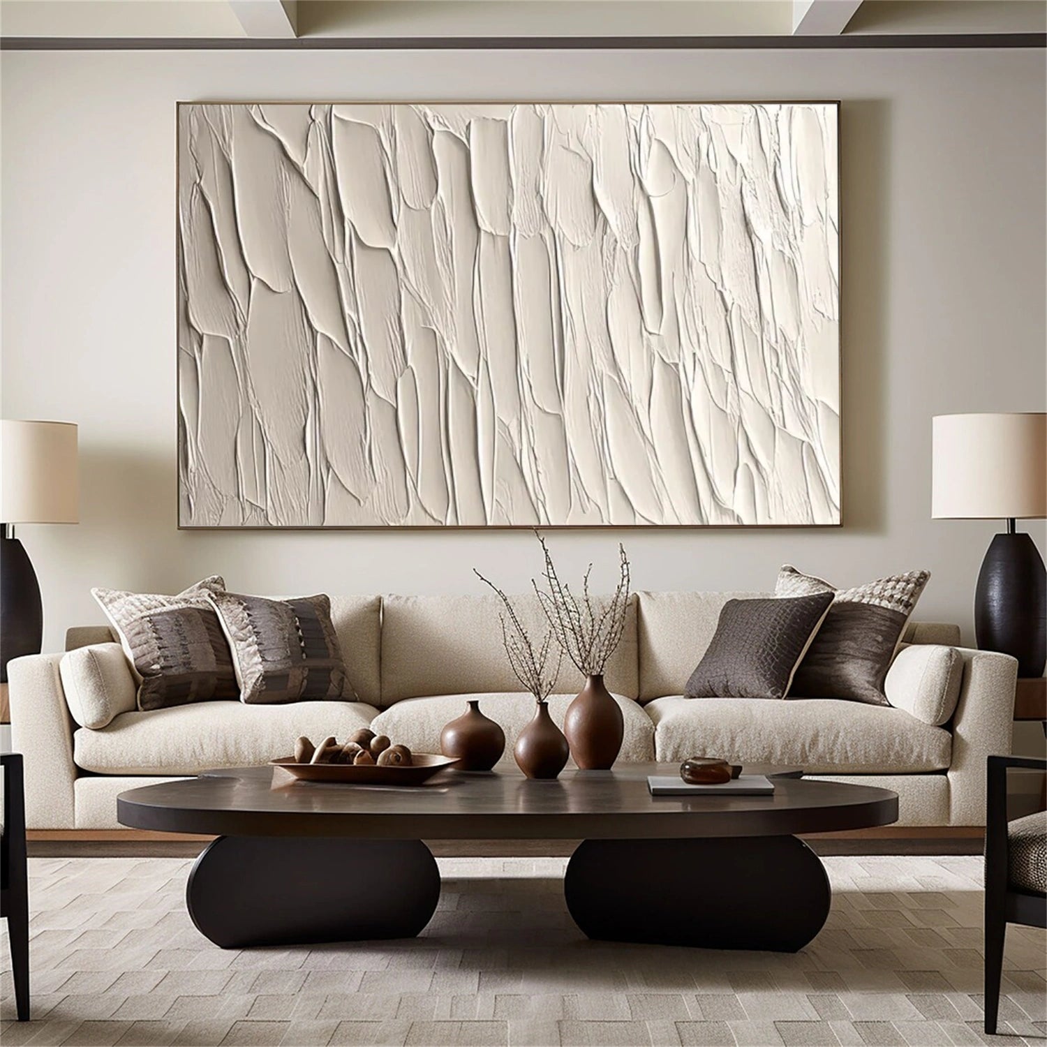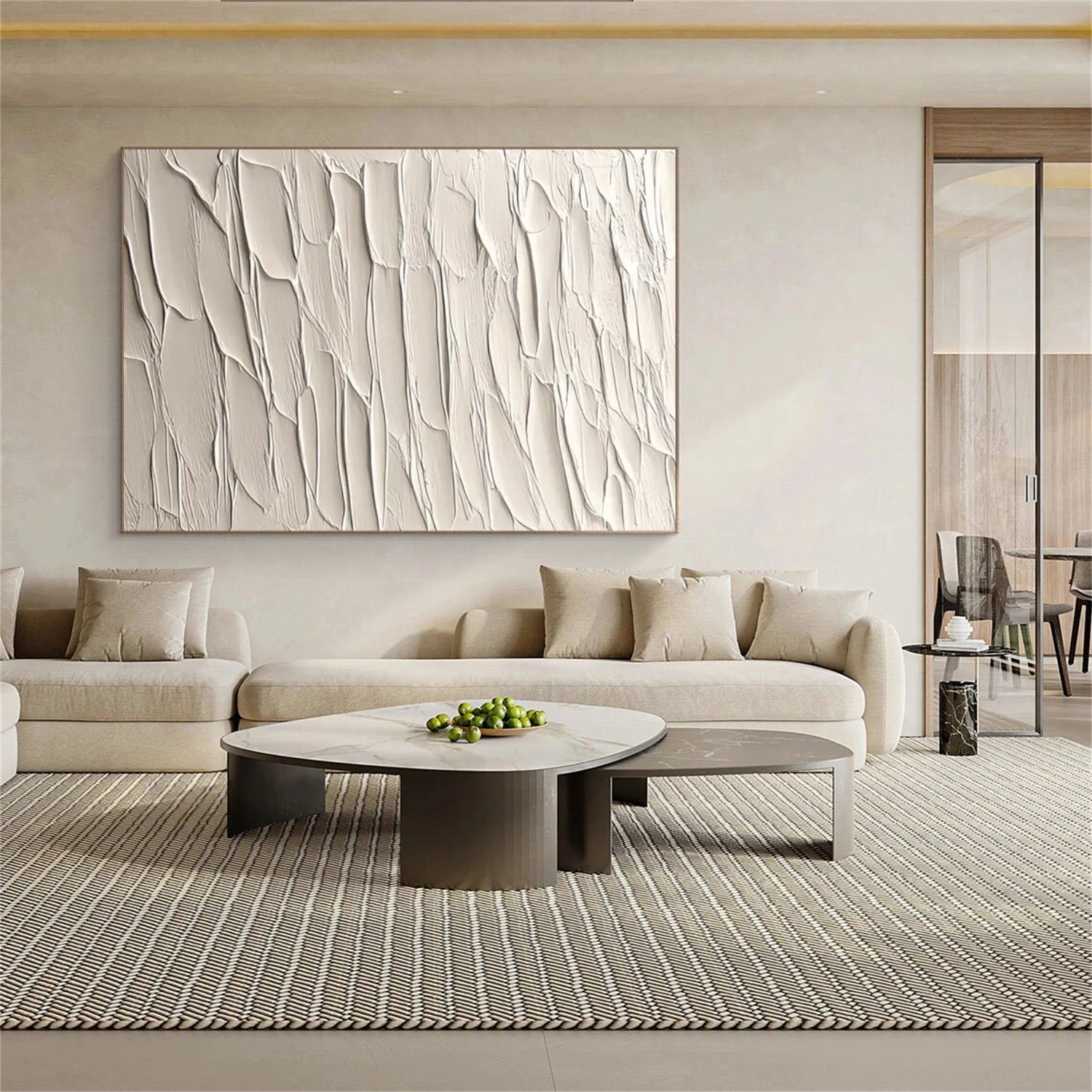 This minimalist abstract painting explores the quiet beauty of layered ivory tones through sculpted palette-knife textures. Vertical strokes rise and fall gently across the canvas, creating a rhythmic surface that shifts subtly with light and shadow.
