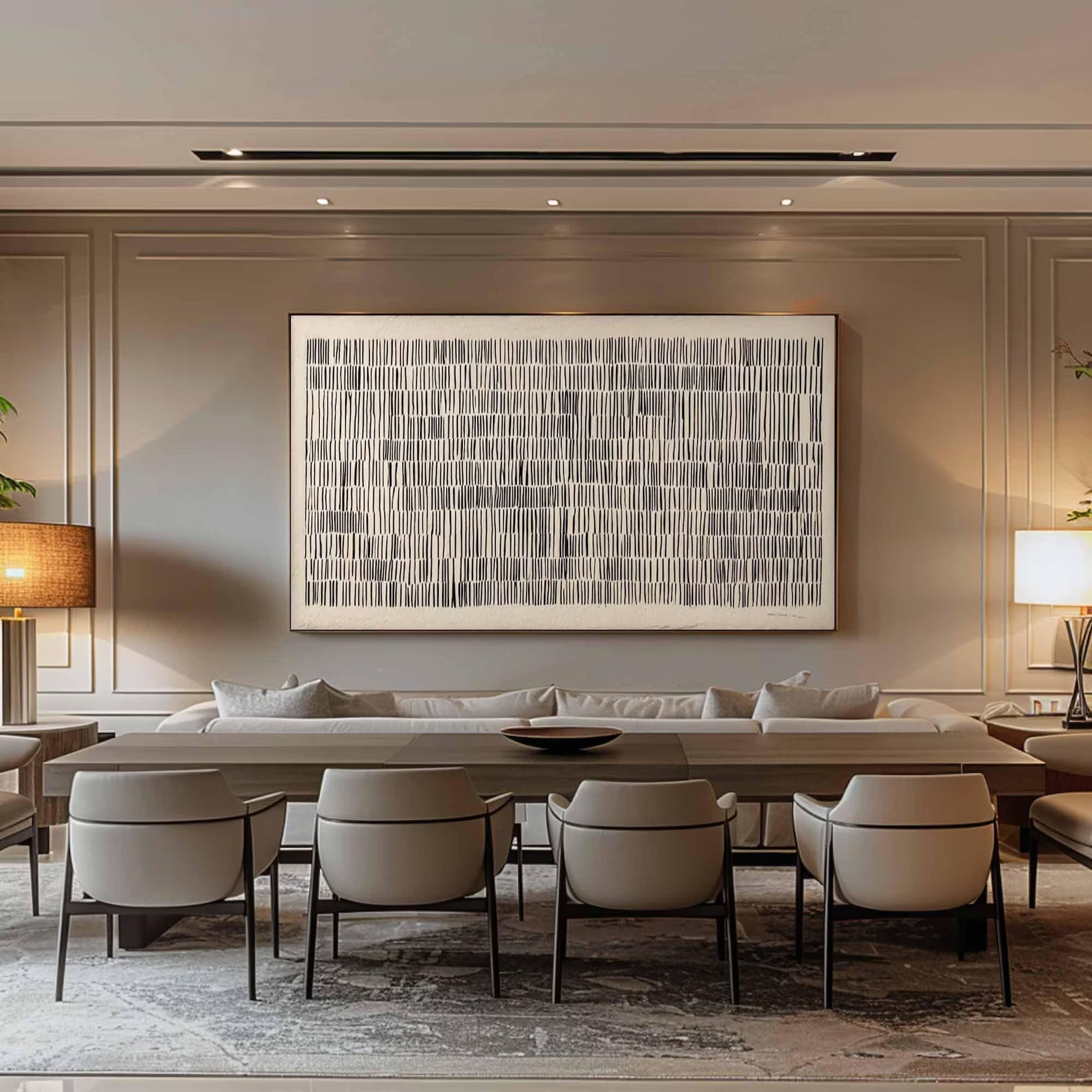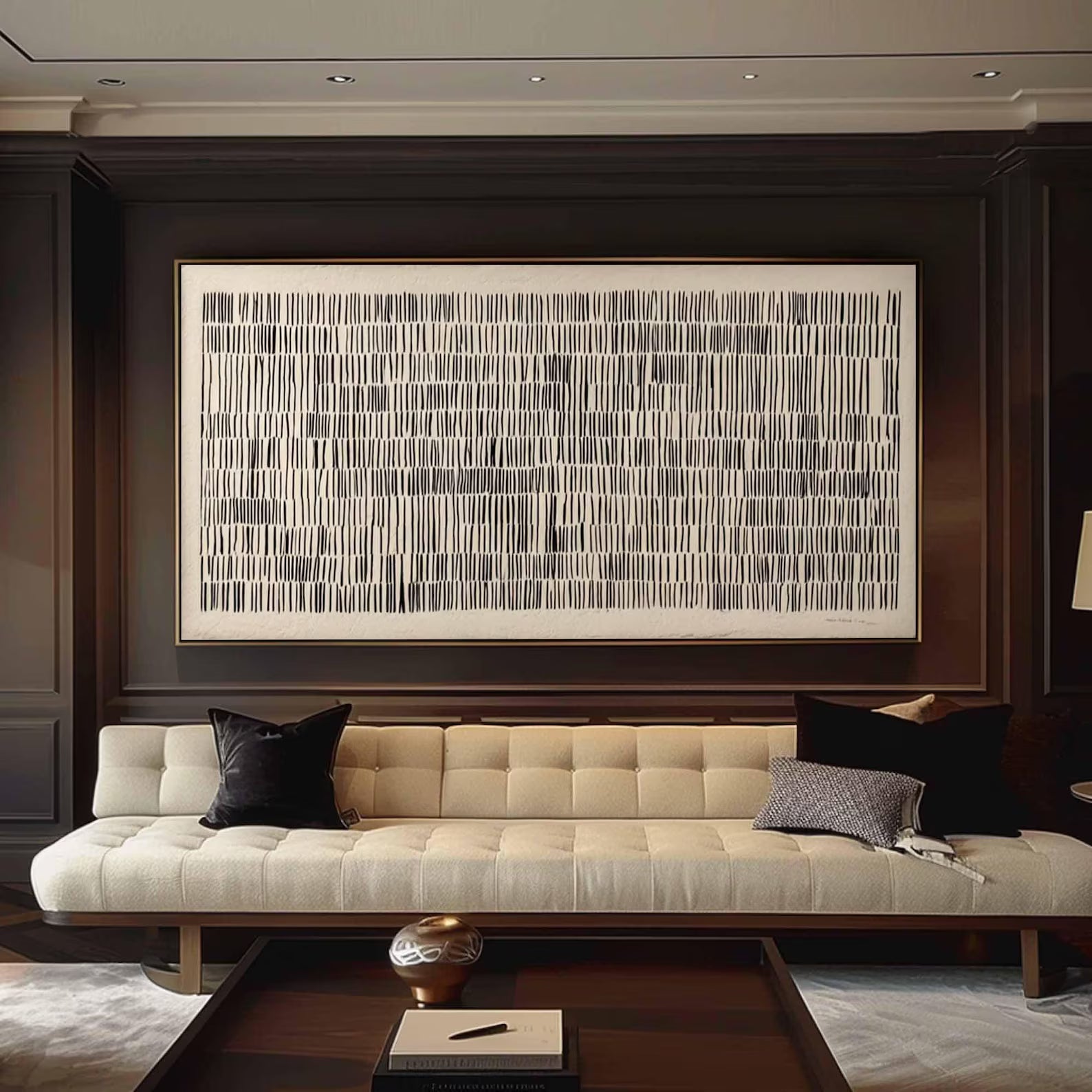 This minimalist design artwork features a captivating rhythm of vertical strokes, forming a modern balance between structure and spontaneity. The neutral palette and clean geometry make it ideal for contemporary interiors, Scandinavian décor, or office spaces. As a statement wall piece, it blends modern linear art with minimalist geometric décor, bringing effortless sophistication into your
