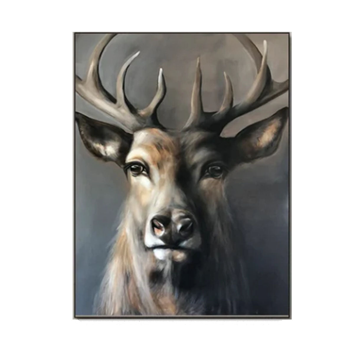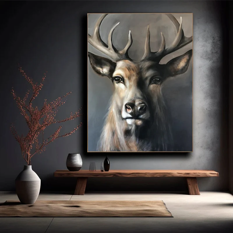 This majestic stag portrait painting captures quiet power and noble serenity. The soft transitions of brown, charcoal, and silver-grey tones highlight the stag’s unwavering gaze and dignified posture. With a subtle glow and calm background, this artwork conveys confidence, clarity, and presence. Featuring a regal woodland aura and a dignified stillness effect, it enhances living rooms, offices, studies, and refined cabin-style interiors.