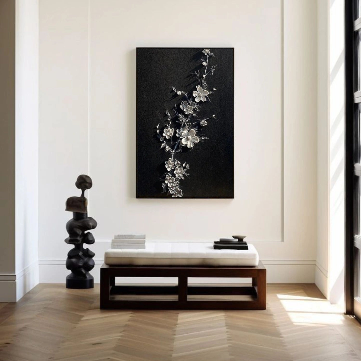 This hand-painted abstract oil painting features silver-white blossoms emerging from a deep black background, creating a striking contrast between light and shadow. Delicate impasto and palette-knife textures give the petals a sculptural presence, while the branching composition feels quiet, refined, and powerful.