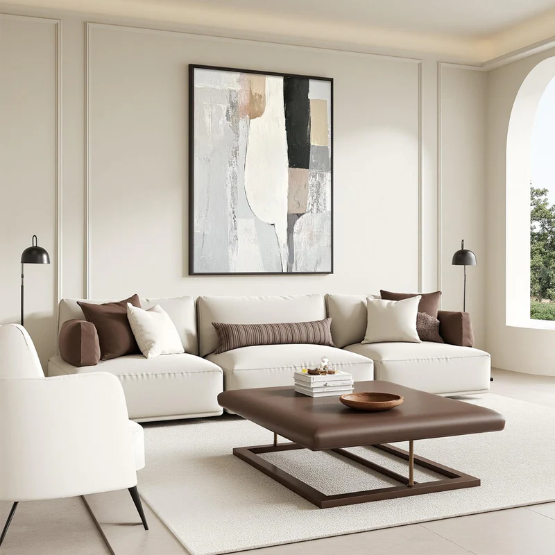 This minimalist abstract painting blends calm geometry with a soothing neutral palette of white, beige, gray, and black. Its layered textures and subtle contrasts create a quiet balance between structure and emotion. The piece embodies modern elegance, perfect for interiors seeking harmony and sophistication.