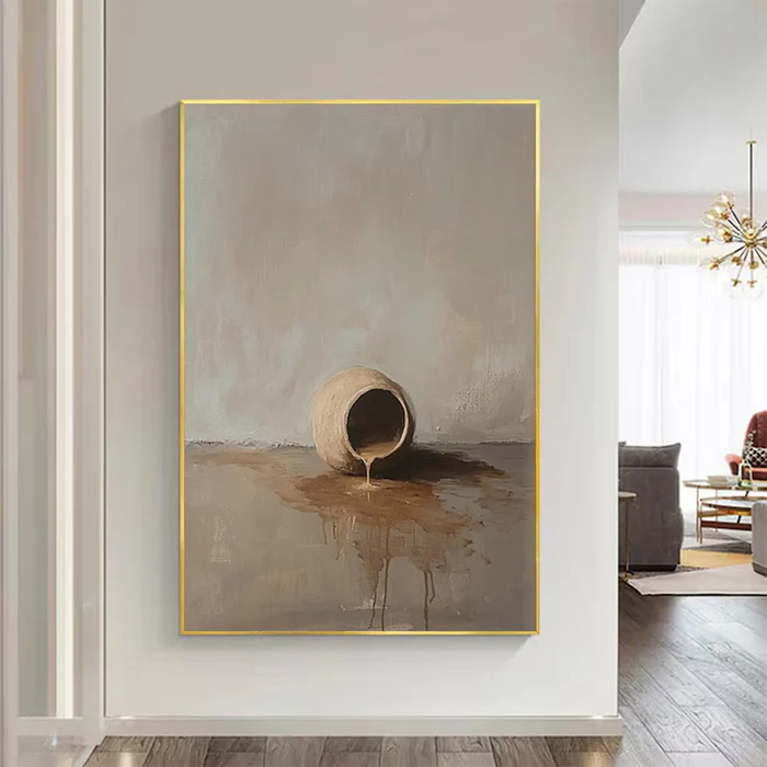 The Still Earth Pottery Painting embodies the essence of simplicity and timeless calm. Featuring a single clay pot resting on an earthen surface, the composition reflects stillness, imperfection, and the quiet passage of time. Muted beige and warm brown tones create a serene atmosphere that invites introspection.