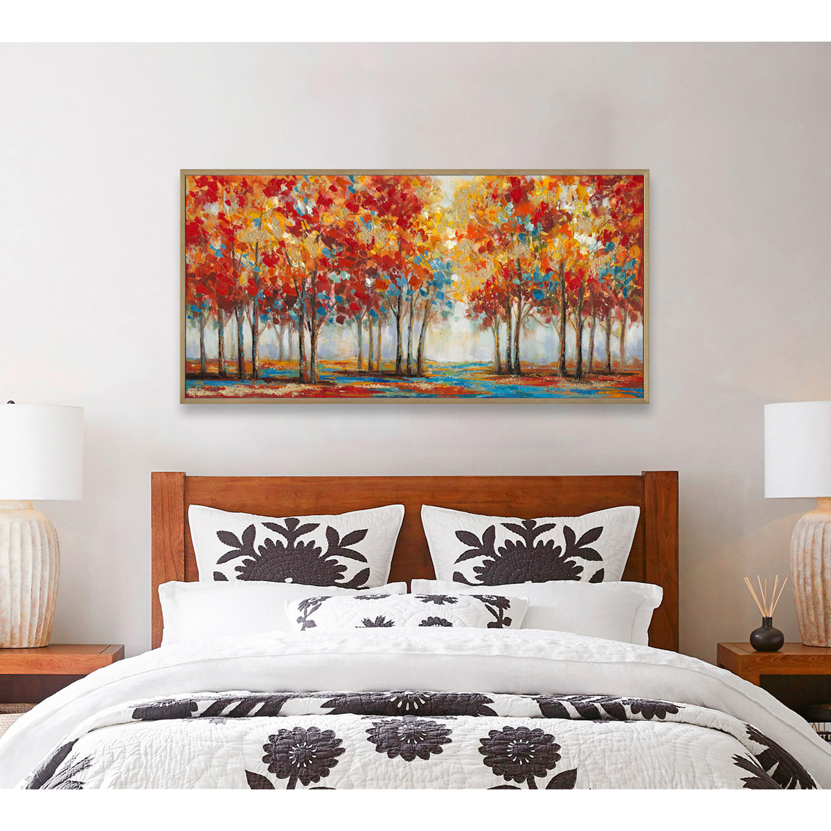 Bold strokes ignite a grove with crimson blaze and festival woodland energy.