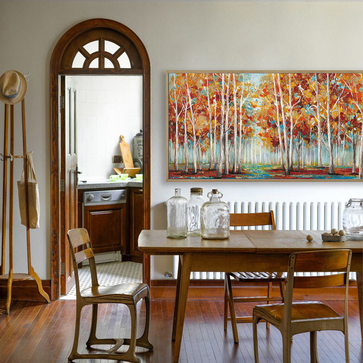 Fiery leaves dance along a birch avenue; crisp strokes and palette-knife leaves add depth and joy.