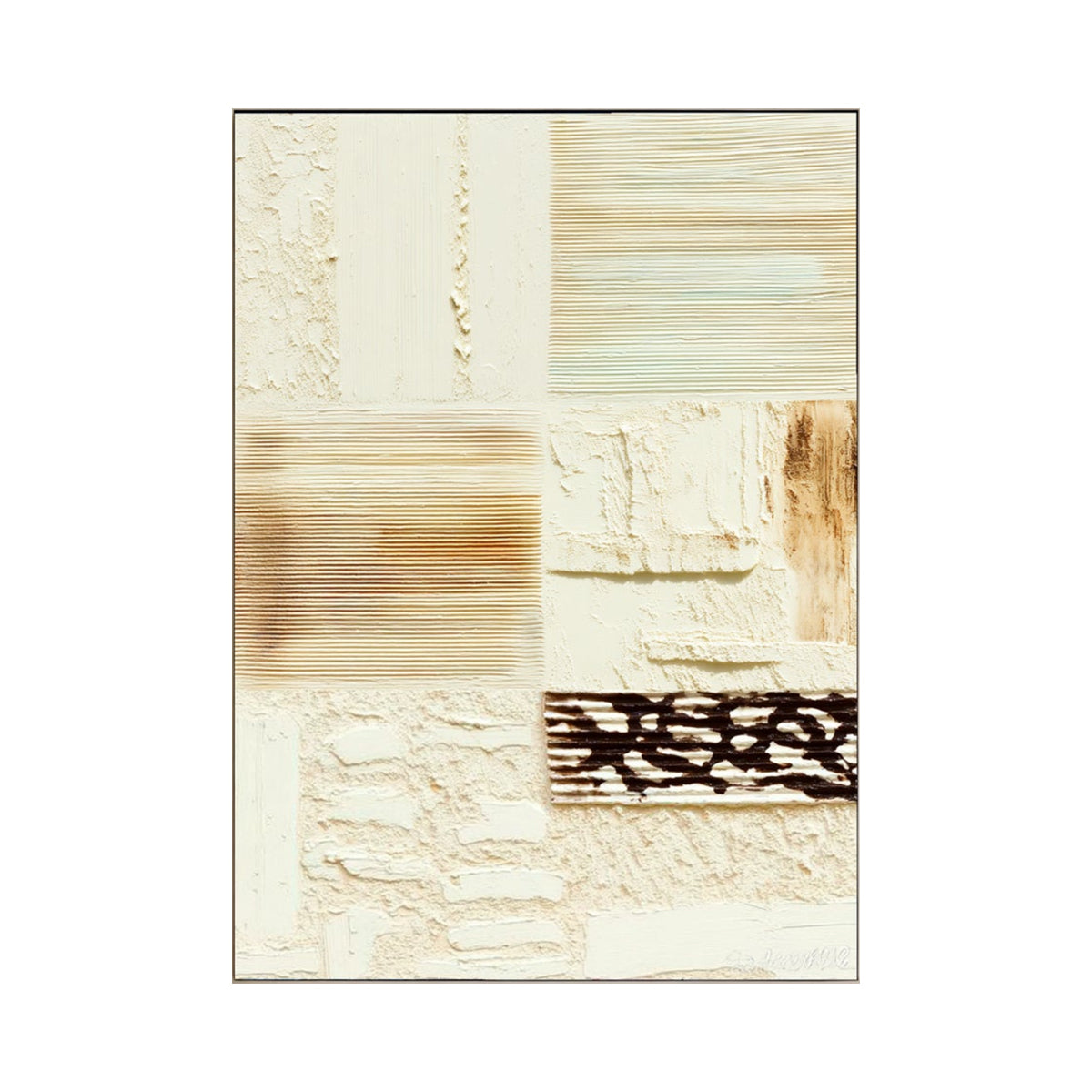This artwork features a sophisticated composition of textured panels in warm neutral tones. Each section displays a unique tactile pattern—smooth grooves, sculpted reliefs, and subtle brushed finishes—creating a refined visual rhythm. Perfect for modern interiors, this modern texture art adds dimensional elegance while maintaining a calming, minimalist look. An ideal centerpiece for living rooms, hallways, or offices seeking neutral abstract wall décor with artisanal character.