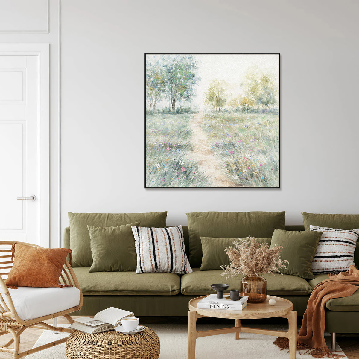 A serene hand-painted landscape of a sunlit meadow with soft wildflowers, bringing peace and freshness into your home.