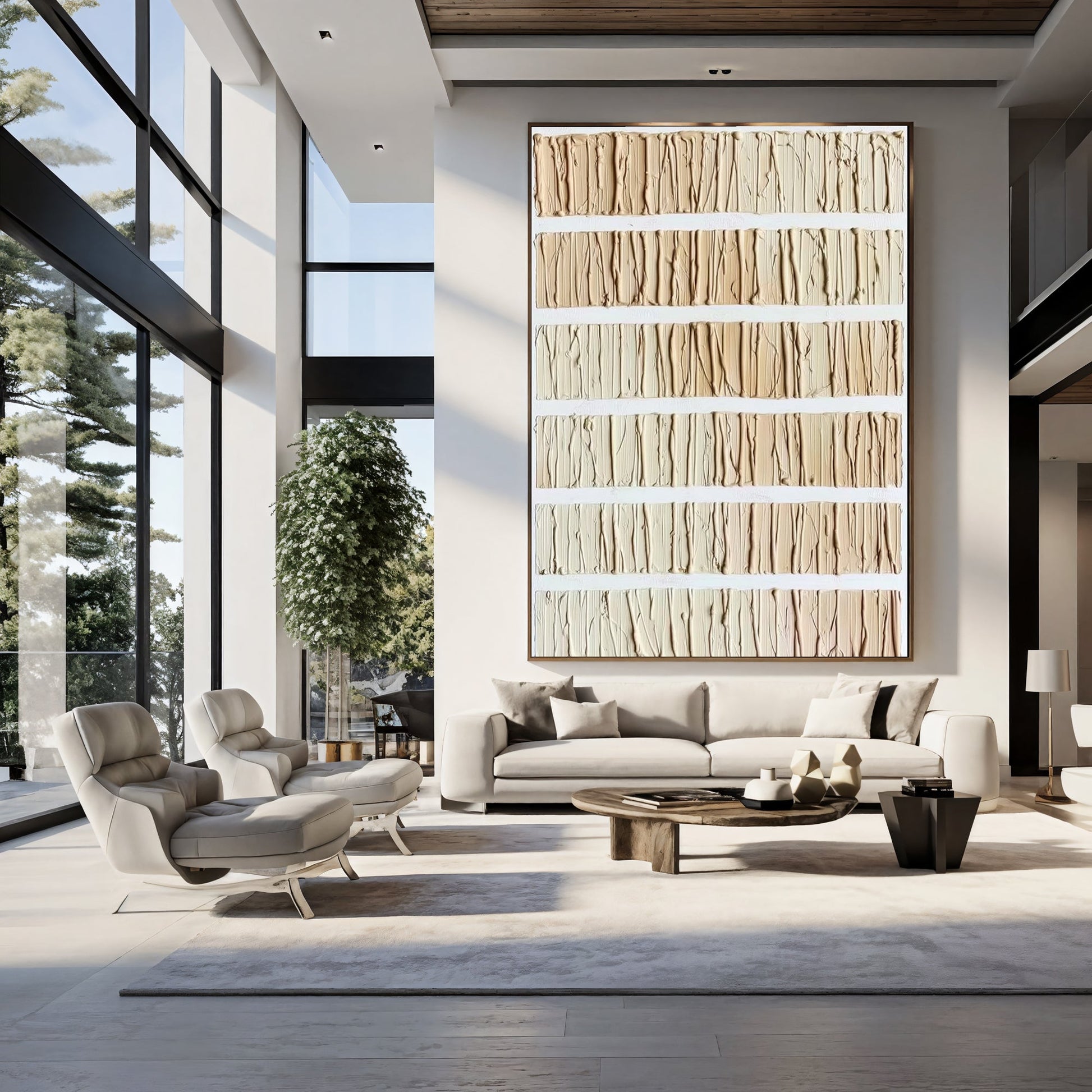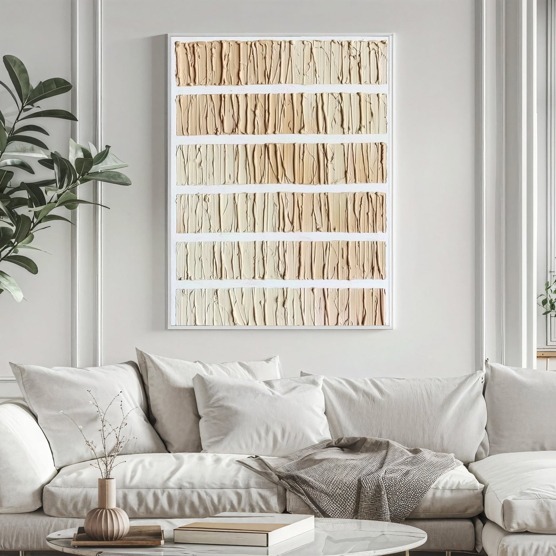 This modern artwork features layered textured stripes in warm neutral tones, hand-painted to create a natural rhythmic flow. The refined vertical patterns bring visual balance and tactile beauty to contemporary spaces. Designed for minimalist and Scandinavian interiors, this striped texture art adds depth without overwhelming the room — a sophisticated choice for living rooms, hallways, and studios seeking neutral minimalist décor.