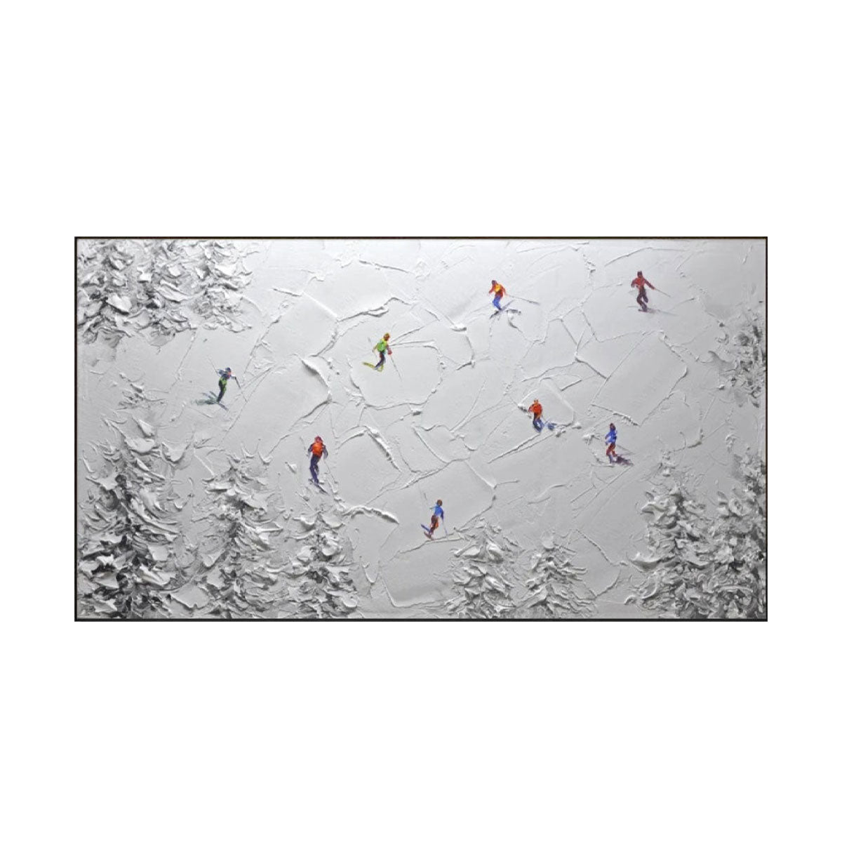 This dramatic textured painting captures a group of skiers descending through a snow-covered forest under a deep night sky. The bold palette-knife strokes create striking depth and dimension, while the bright ski outfits bring vibrant pops of color against the monochrome winter landscape. Snow-laden pine trees add structure and atmosphere, making this piece a captivating blend of motion and contrast.