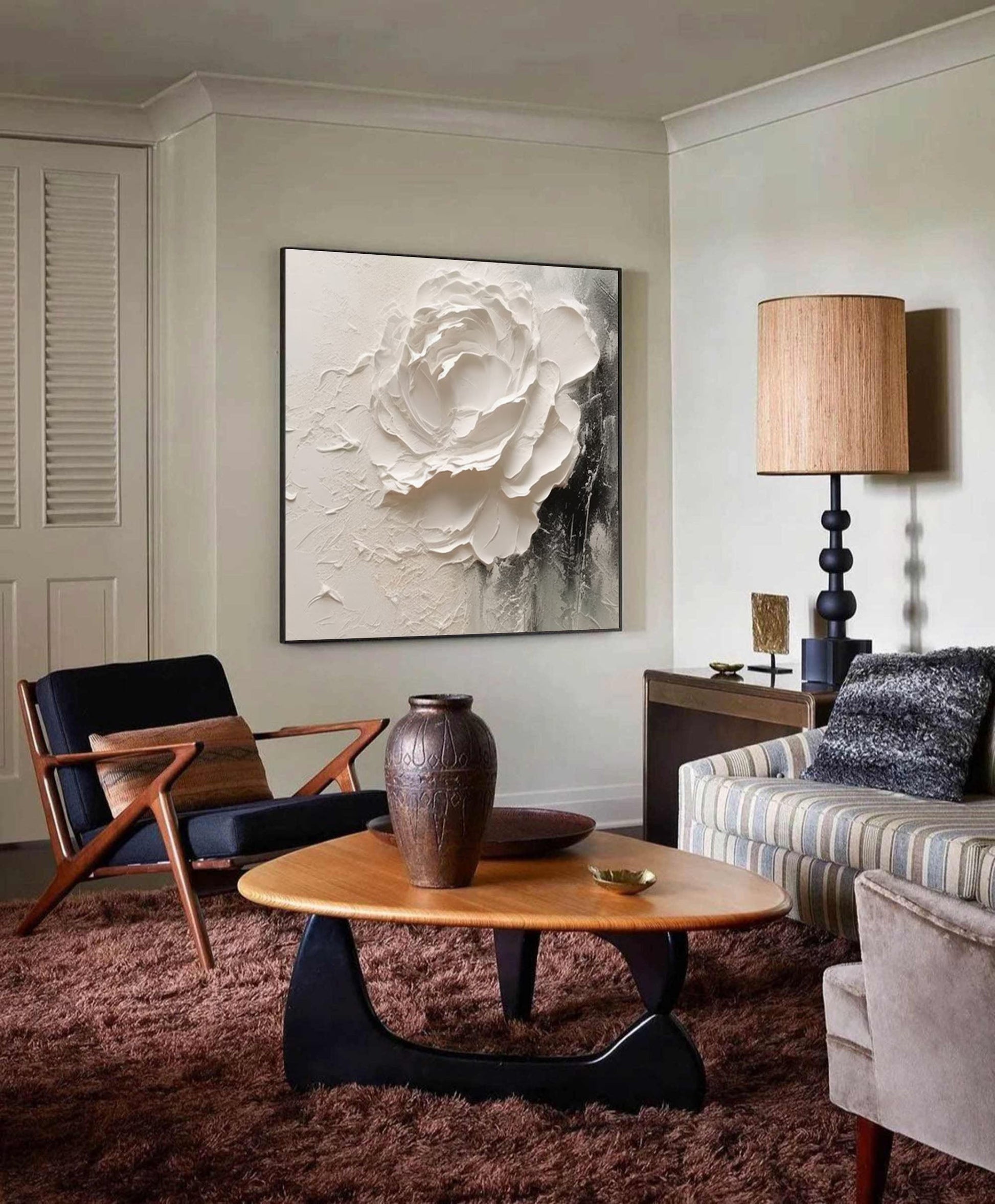 The restrained monochrome palette enhances its timeless beauty, allowing texture and form to take center stage. As a refined white textured floral wall art, this piece brings calm sophistication to modern interiors and serves as an elegant minimal floral abstract painting for living rooms, bedrooms, or gallery-inspired spaces