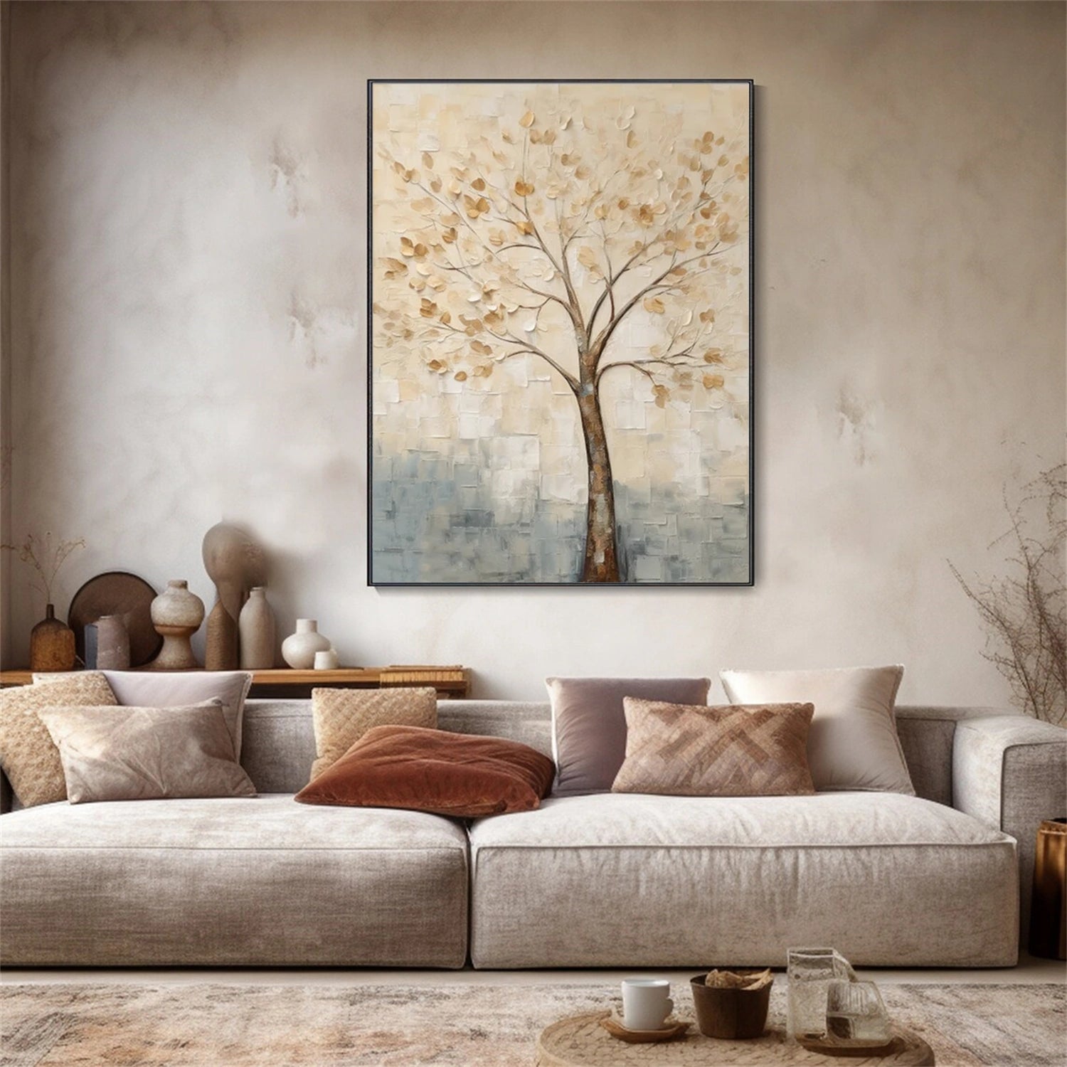 Refined and understated, this piece complements minimalist, wabi-sabi, and soft luxury interiors beautifully. As a symbolic Ivory Calm Tree Art work, it conveys stability, purity, and inner balance. Its restrained palette and tactile surface also define it as a graceful Minimal Neutral Landscape Painting, bringing serenity and elegance to any space.