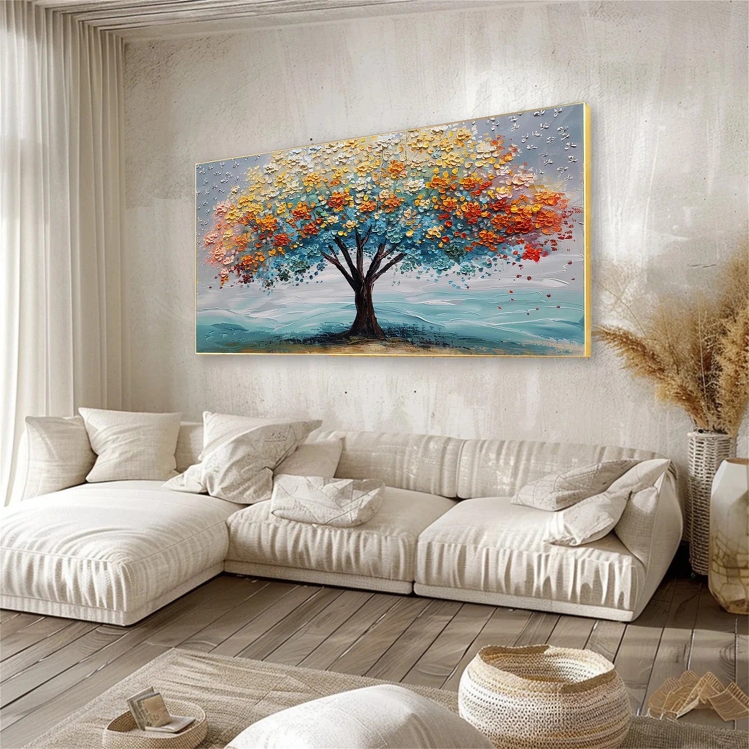 With its expressive palette and sculptural texture, this artwork stands out as elegant Four seasons tree wall art and a refined Textured abstract tree painting, perfect for living rooms, studies, or offices seeking harmony, inspiration, and contemporary artistic character.