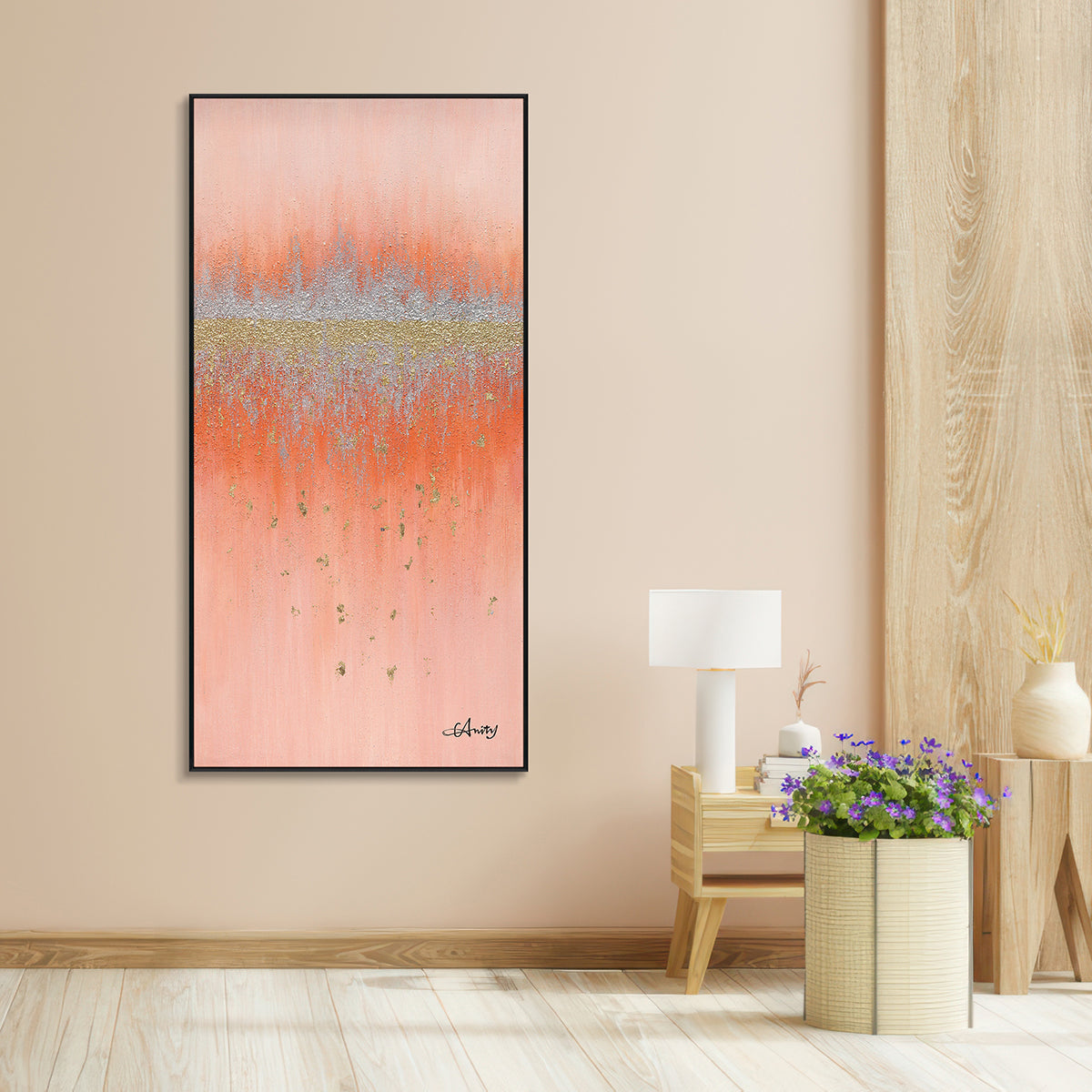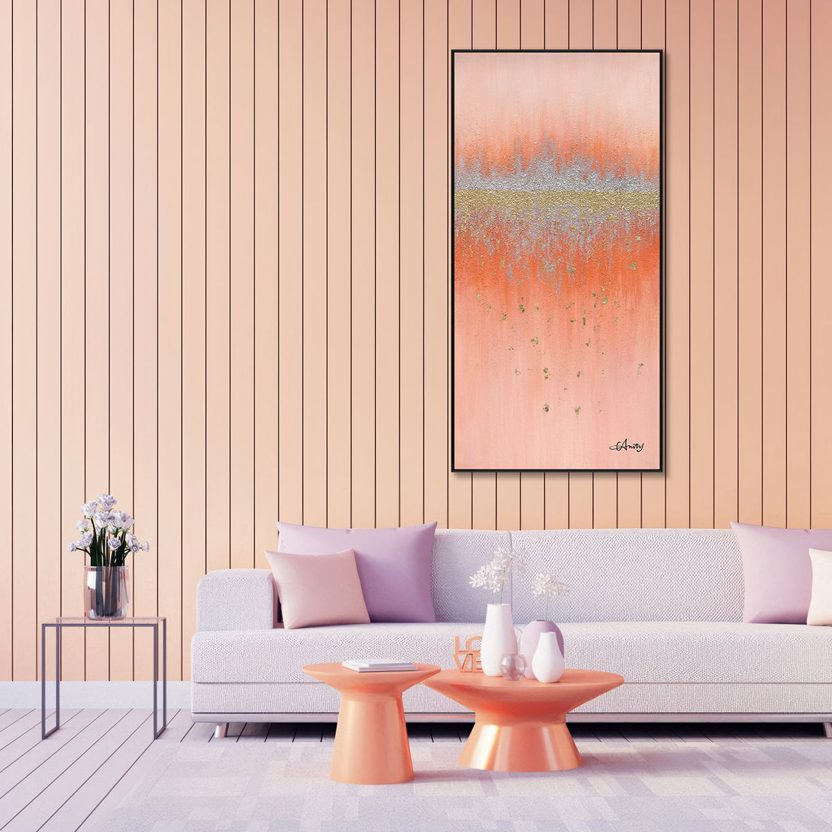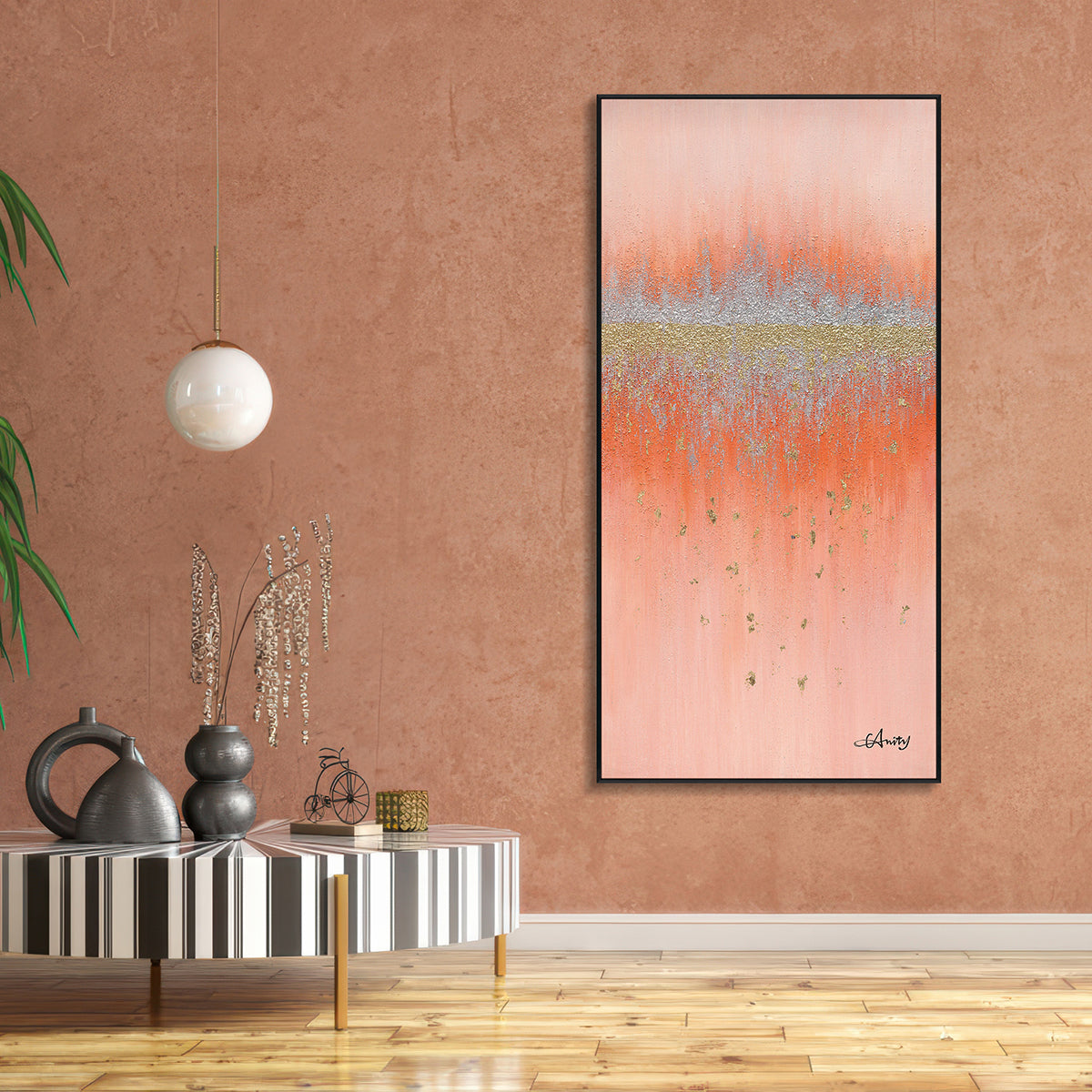 A radiant abstract metallic painting in shades of rose pink, silver, and gold. The delicate gradient flows from soft blush tones to shimmering metallic layers, evoking the first light of dawn. Each stroke is hand-textured, creating a tactile surface that captures elegance and calm. This modern luxury wall art infuses warmth and refinement, making it a perfect choice for contemporary living rooms, bedrooms, or boutique interiors.