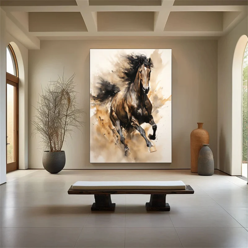 This dynamic stallion painting captures explosive movement and raw vitality as the horse charges forward through dust and wind. Rich brown tones blend with dramatic shadows to express strength, freedom, and unstoppable momentum. With an ignited motion energy and dust-borne dramatic impact, this artwork becomes a bold centerpiece for living rooms, offices, and luxury interiors, infusing the space with confidence and exhilarating spirit.