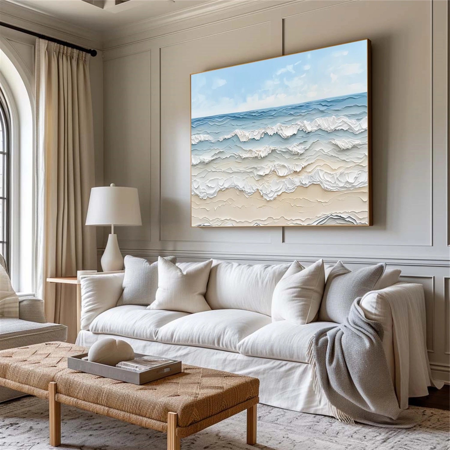 This Sea Breeze Textured Wave Painting showcases calming layers of ocean waves rolling toward a soft sandy shore. Created with a palette knife, the artwork features beautifully sculpted textures that mimic the natural rhythm of the sea.