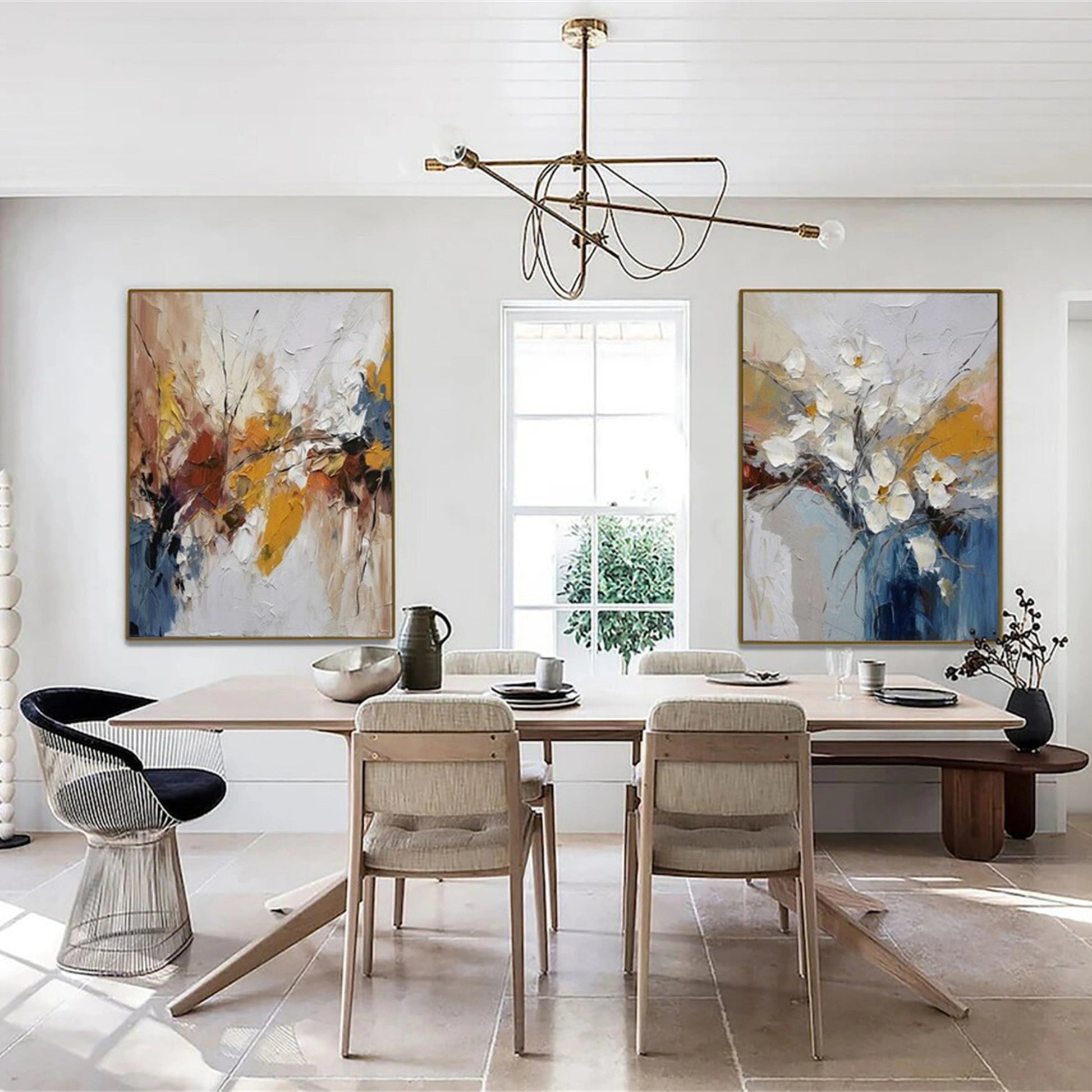 This diptych abstract painting set features soft ivory and muted blue backgrounds layered with warm ochre, golden yellow, and deep navy palette-knife strokes. The composition evokes branches and blossoms gently moving through an autumn breeze, balancing expressive energy with refined restraint.