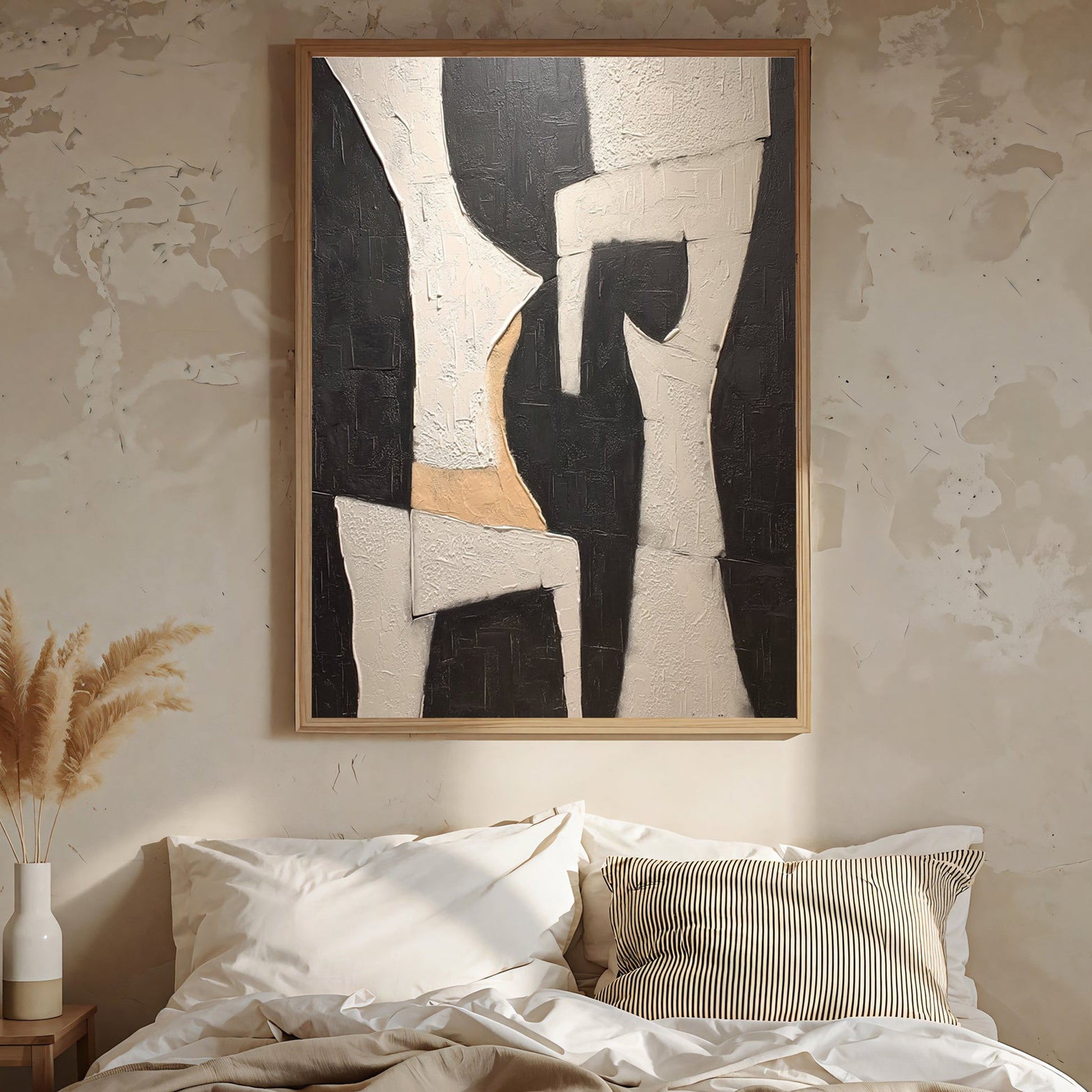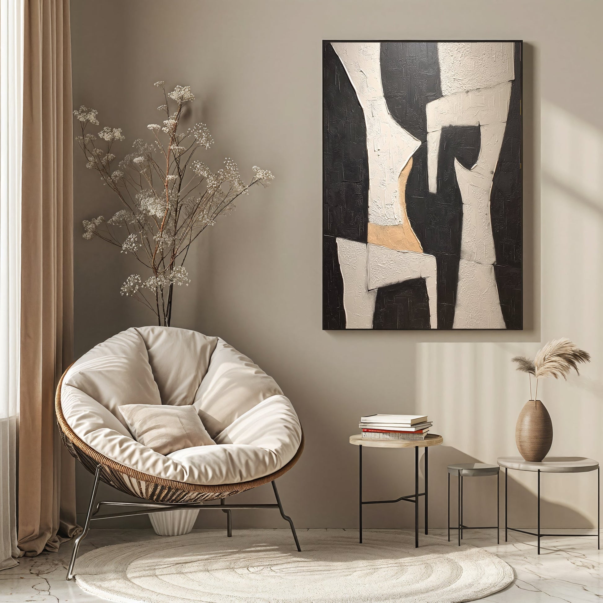 A bold interplay of black and white forms creates a captivating composition reminiscent of intertwined human silhouettes. The tactile, hand-painted textures highlight movement and contrast, while the warm beige accent adds a subtle artistic tension at the center. This modern abstract wall art brings a striking sculptural presence to living rooms, office spaces, or gallery-style interiors. Its bold contrast design elevates any atmosphere with sophistication and contemporary flair.