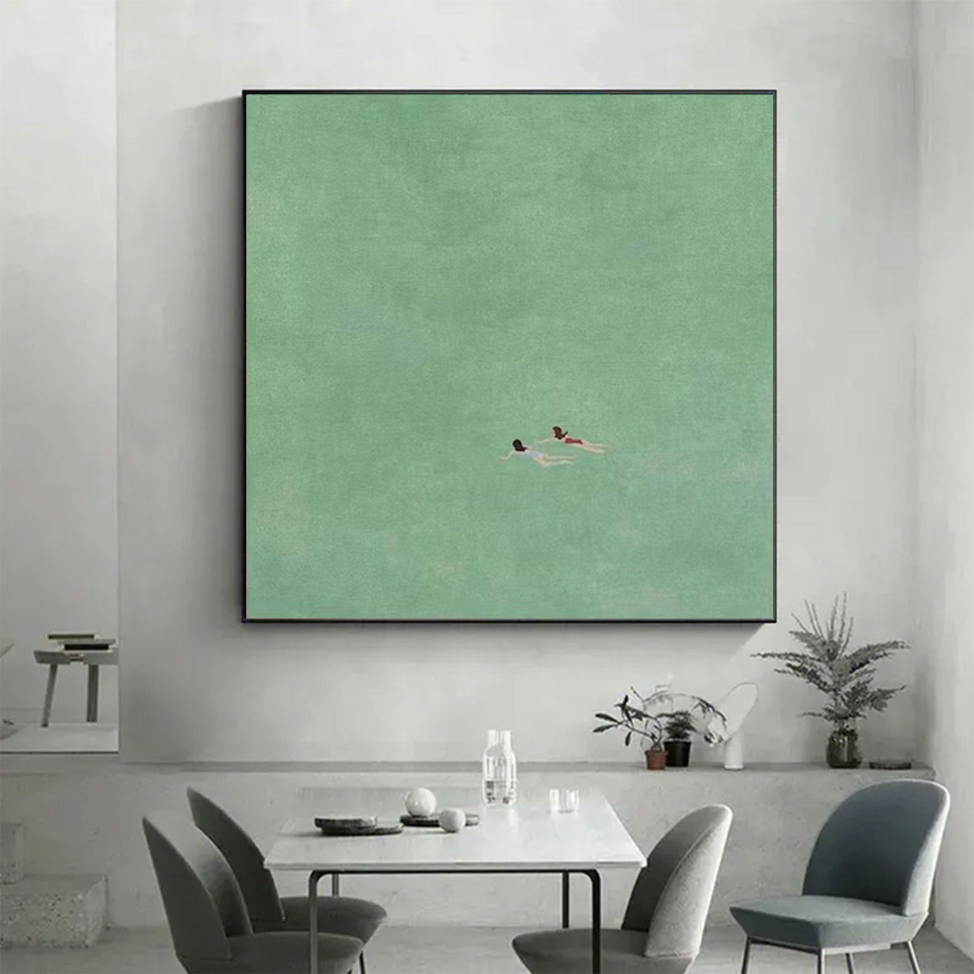 This minimalist seascape painting captures two floating figures suspended in a vast mint-green ocean, viewed from above. The near-empty composition and softened texture evoke stillness, freedom, and quiet connection, allowing the viewer’s mind to drift with the water.