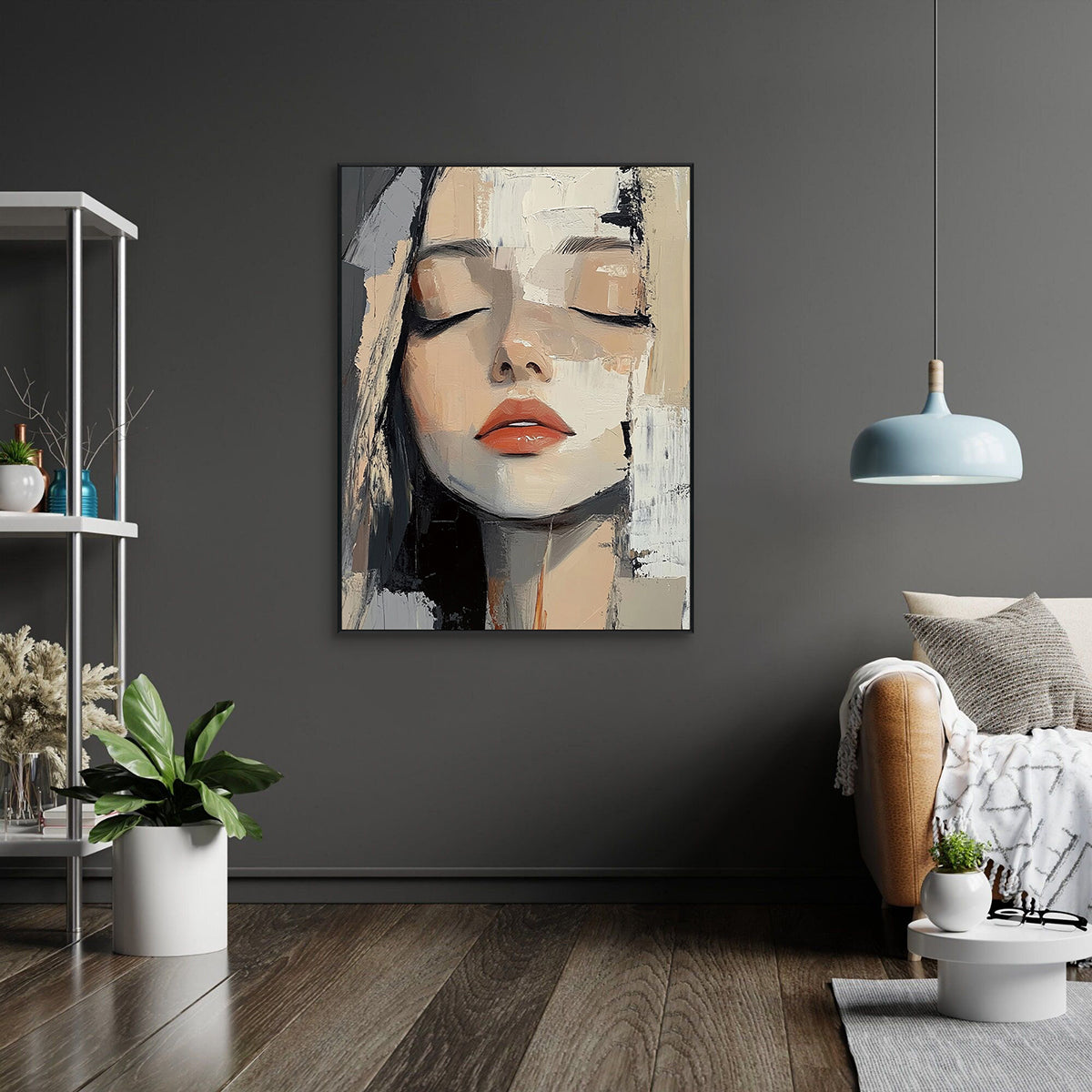 This abstract portrait of a woman captures a serene moment of introspection and quiet strength. The artist’s use of thick brushstrokes and a neutral palette creates a tactile and emotional depth, blending realism with abstract expression. The woman’s closed eyes and soft lips convey inner calm, making this piece a perfect centerpiece for modern interiors. Combining the elegance of figurative art with the raw beauty of texture, it embodies the essence of modern portrait painting and textured feminine art, evoking both tranquility and emotional resonance.