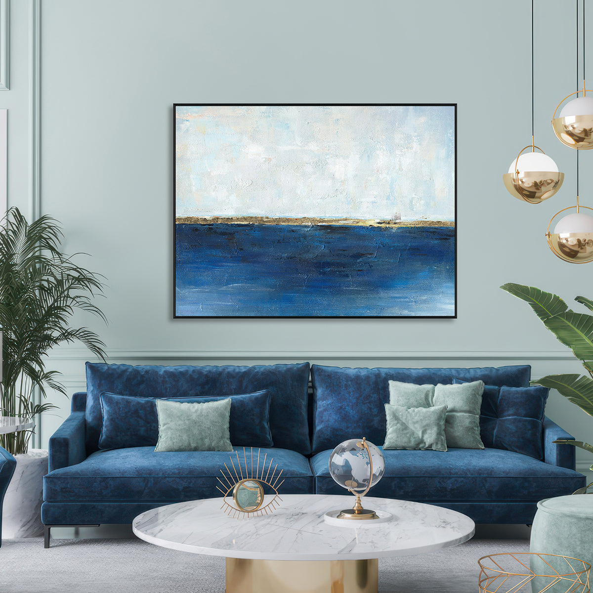 A tranquil abstract seascape painting portraying the meeting of sky and ocean in soft, layered textures. The calm blue tones and subtle golden shoreline evoke peace and endless distance, offering a meditative visual experience. Hand-painted with delicate brushwork, this modern coastal wall art brings serenity and sophistication to living rooms, bedrooms, or any contemporary interior.