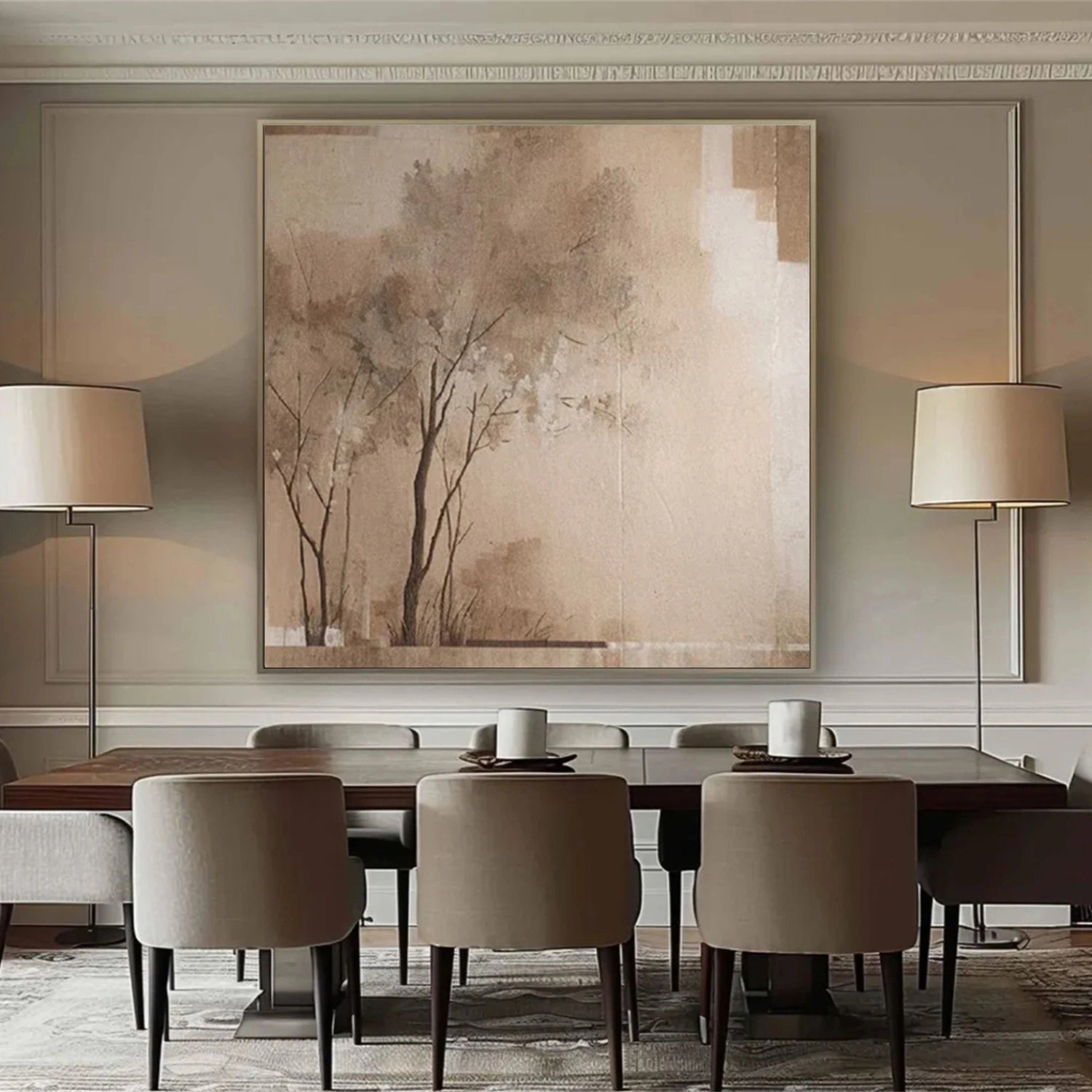This artwork features a soft, misty palette of warm beige and earthy neutrals, where slender tree silhouettes emerge quietly from layered textures. Subtle washes and restrained brushwork create a sense of stillness and space, evoking a calm landscape suspended in time. The composition feels balanced, meditative, and gently atmospheric.